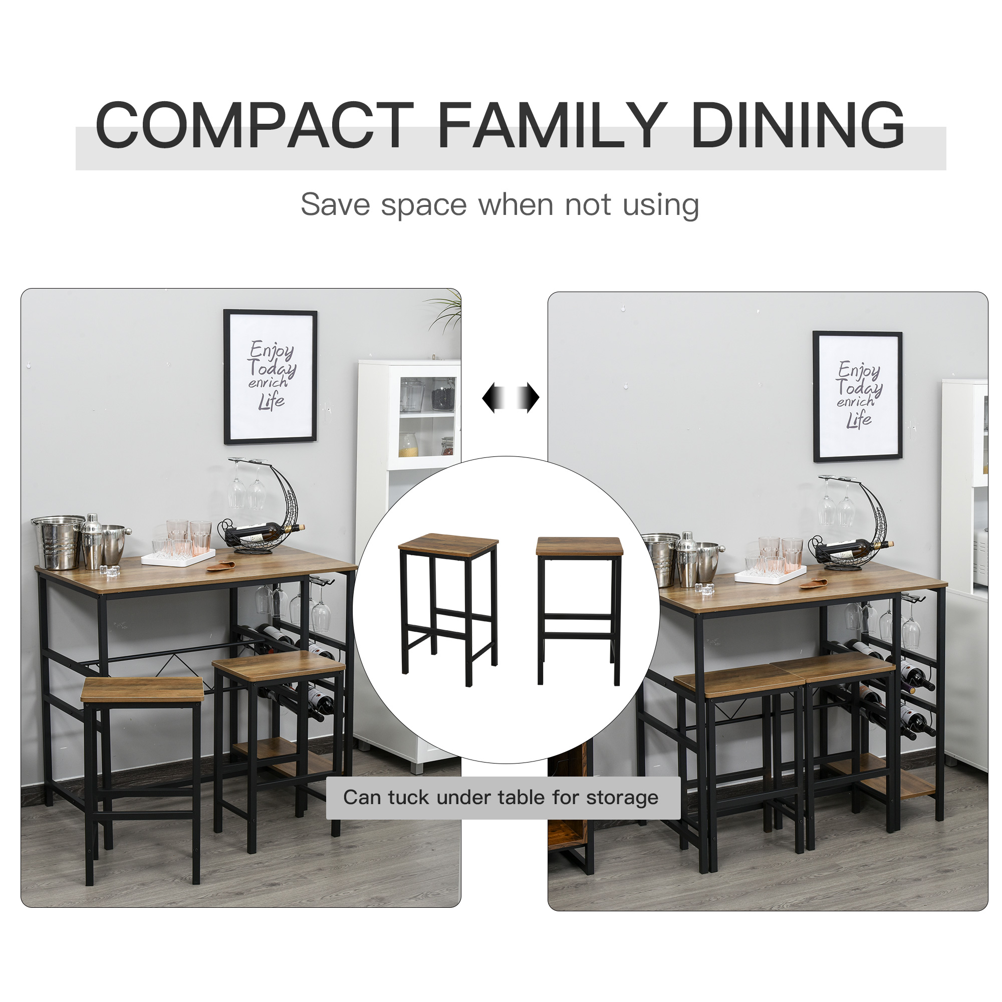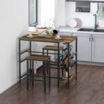 - Modern Dining Set: 3 Pieces dining table and chairs set with vintage wood grain color top and black frame. Tuck-in counter stools underneath the table to save space when not using. Simple yet chic design bar bistro table is best choice for kitchen, pub, living room and dining room.