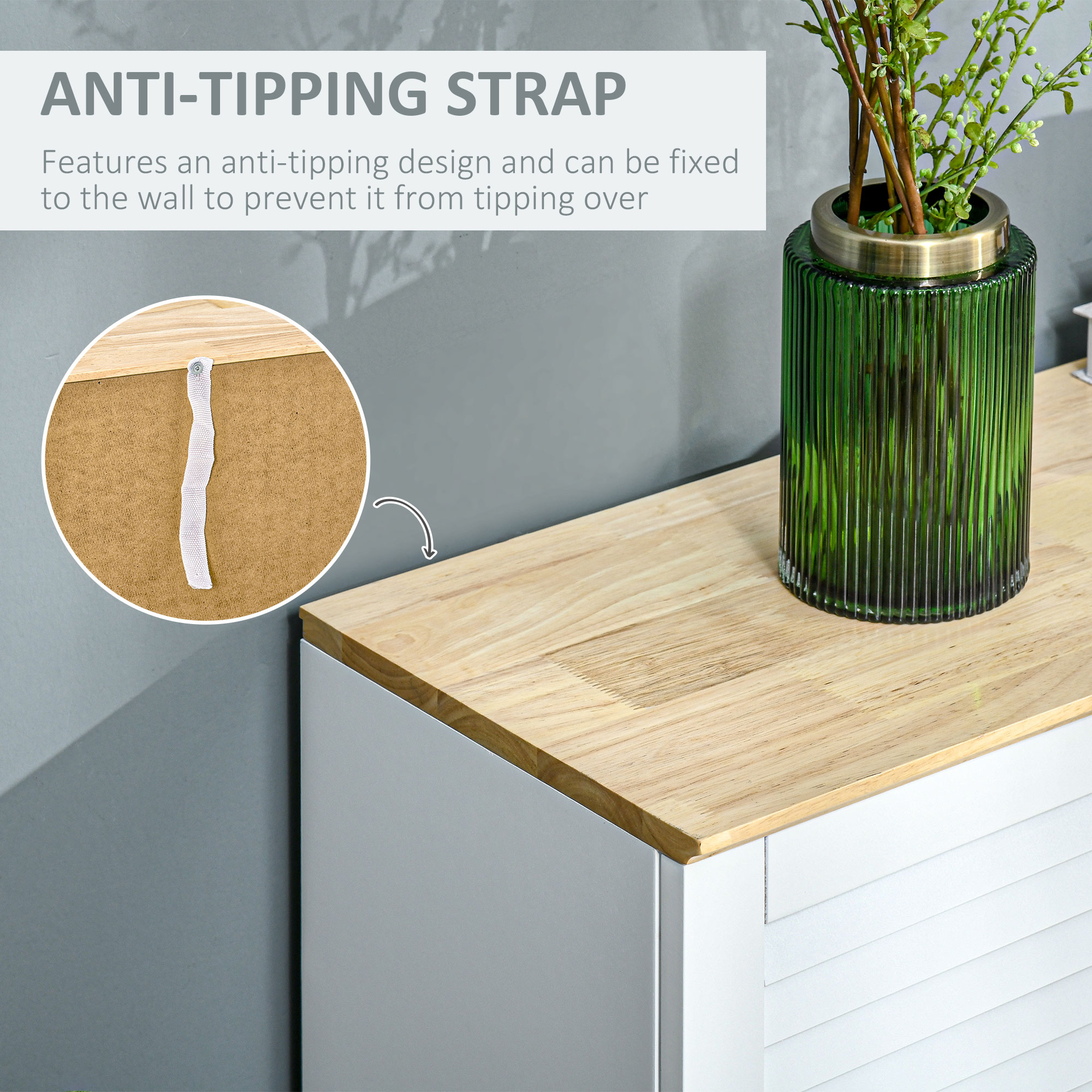 - Anti-Tipping Strap: This freestanding sideboard cabinet features anti-tipping strap and can be fixed to the wall to prevent it from tipping over