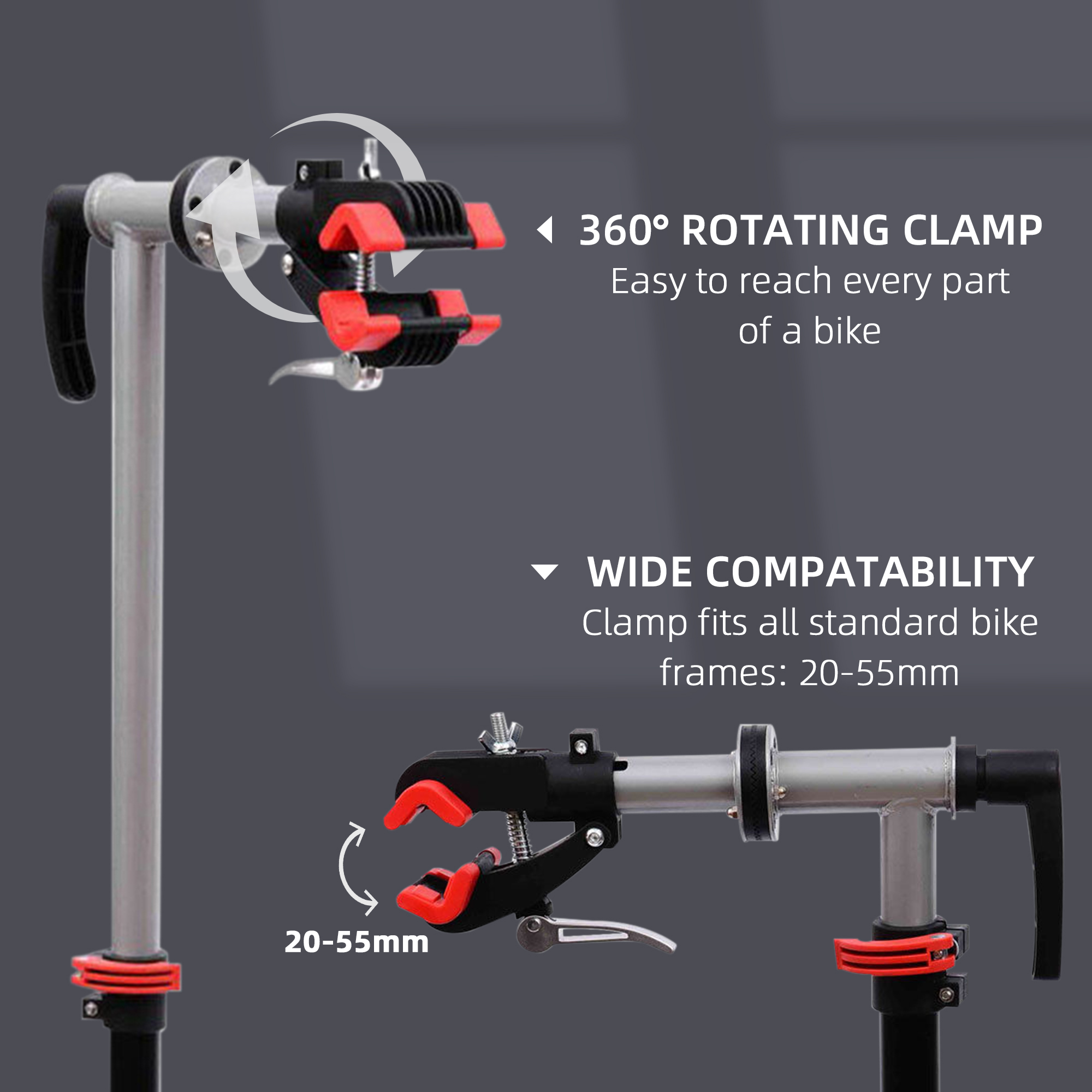 - Bicycle repair stand’s finest support jaws can grip bike securely for avoiding any damage, and 360 degree rotatable QR grip for quickly remove