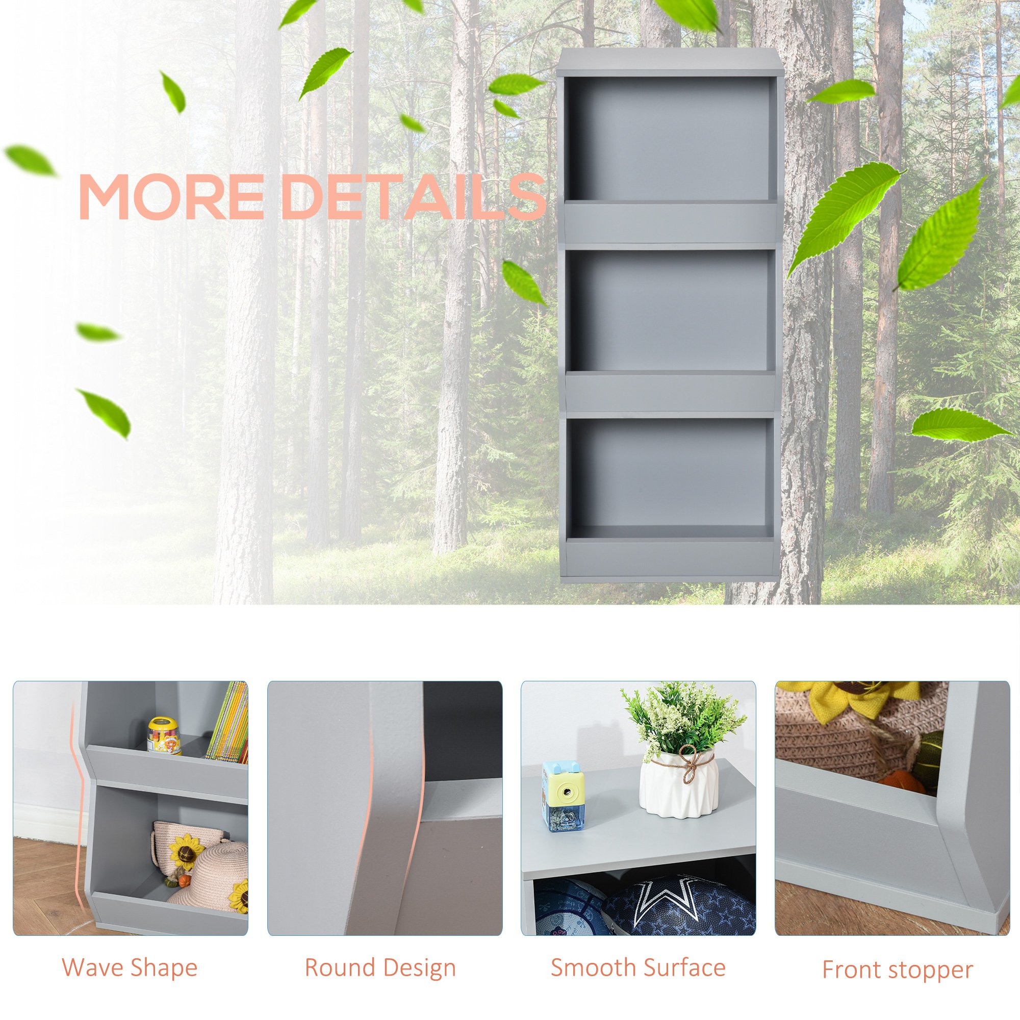 - Three Shelves: Three shelves’ kids storage cabinet with wavy shape side, increase the storage space to store and display child’s books, toys, basketball and so on, front baffle stopper prevents items from falling. Ergonomic size design matches your sweetie’s height, encourages them to store and take what they need by themselves.