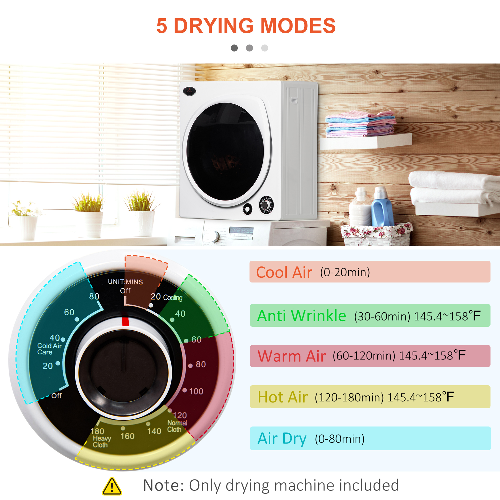 - Multifunctional: This electric dryer machine features 5 modes to cater to your needs – including excellent air (0-20min), anti-wrinkle (30-60min), warm air (60-120min), hot air (120-180min), and air dry (0-80min), as well as 2 heating options.
