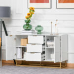 - Elegant Style: Incorporate a sleek sideboard with geometric lined doors, a luxurious golden base and hardware accents, elevating your interior decor with a sophisticated contemporary touch.