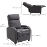 - Recliner Sofa Dimensions: Overall (Upright): 27.25″W x 34.75″D x 39.75″ H. Reclining Dimensions: 27.25″W x 61.5″D x 29.25″ H. Seat Dimensions: 19.25″W x 19.75″D x 17.25″ H. Assembly is required.