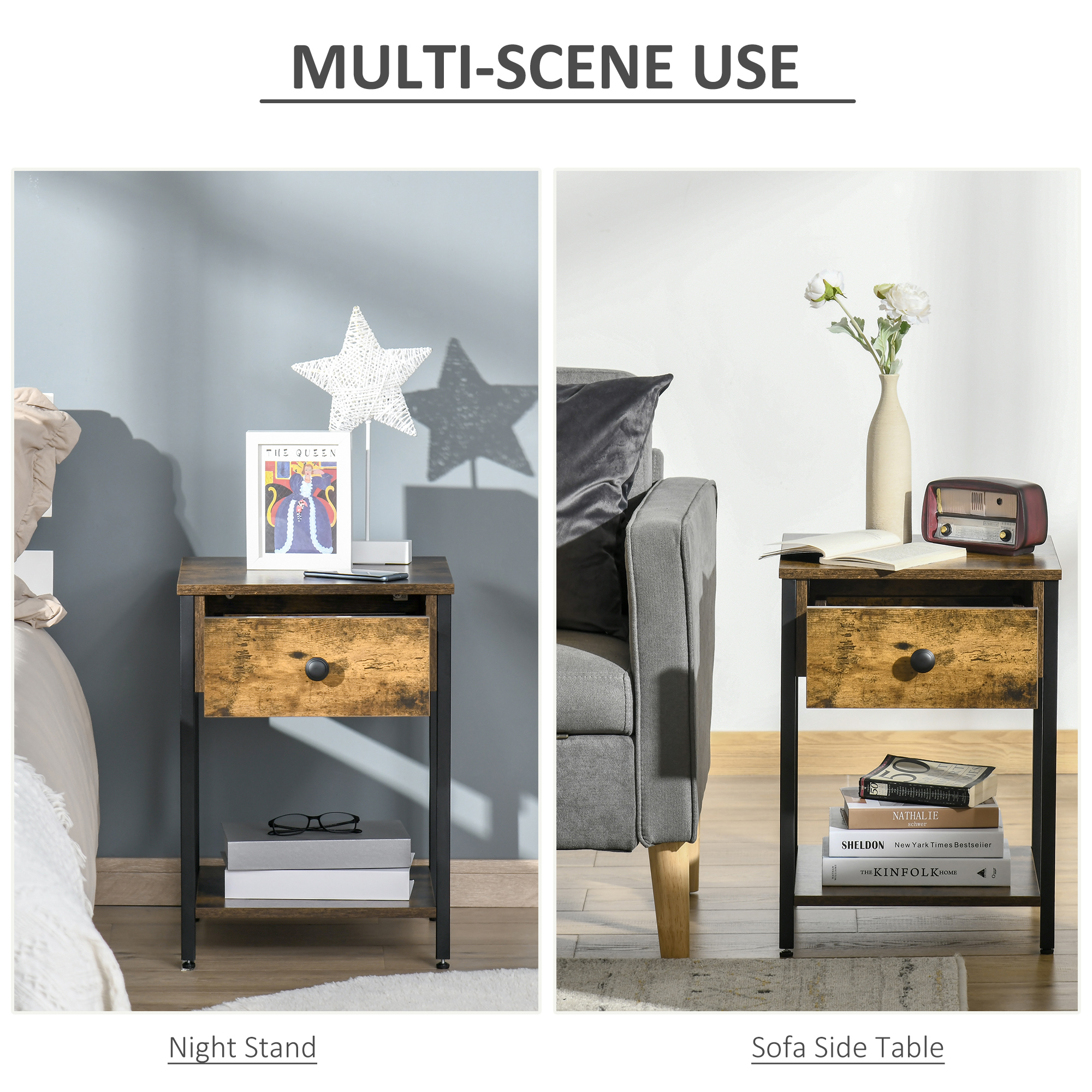 - Industrial Style: The single drawer side table with wood grain panel and black steel frame create a unique display of delicate charm that pairs well with any furniture in your home.