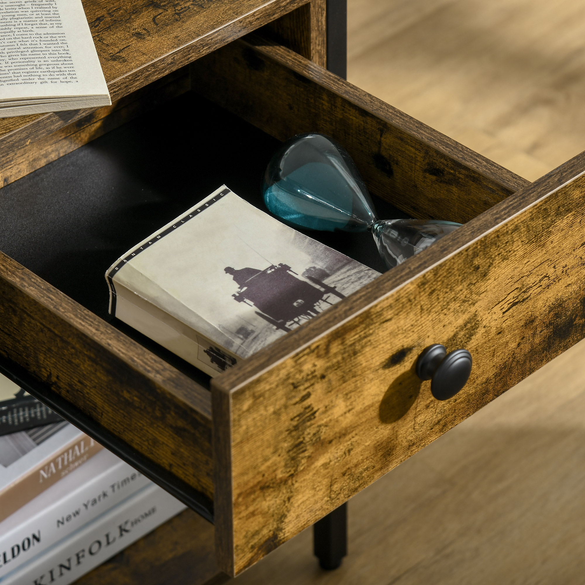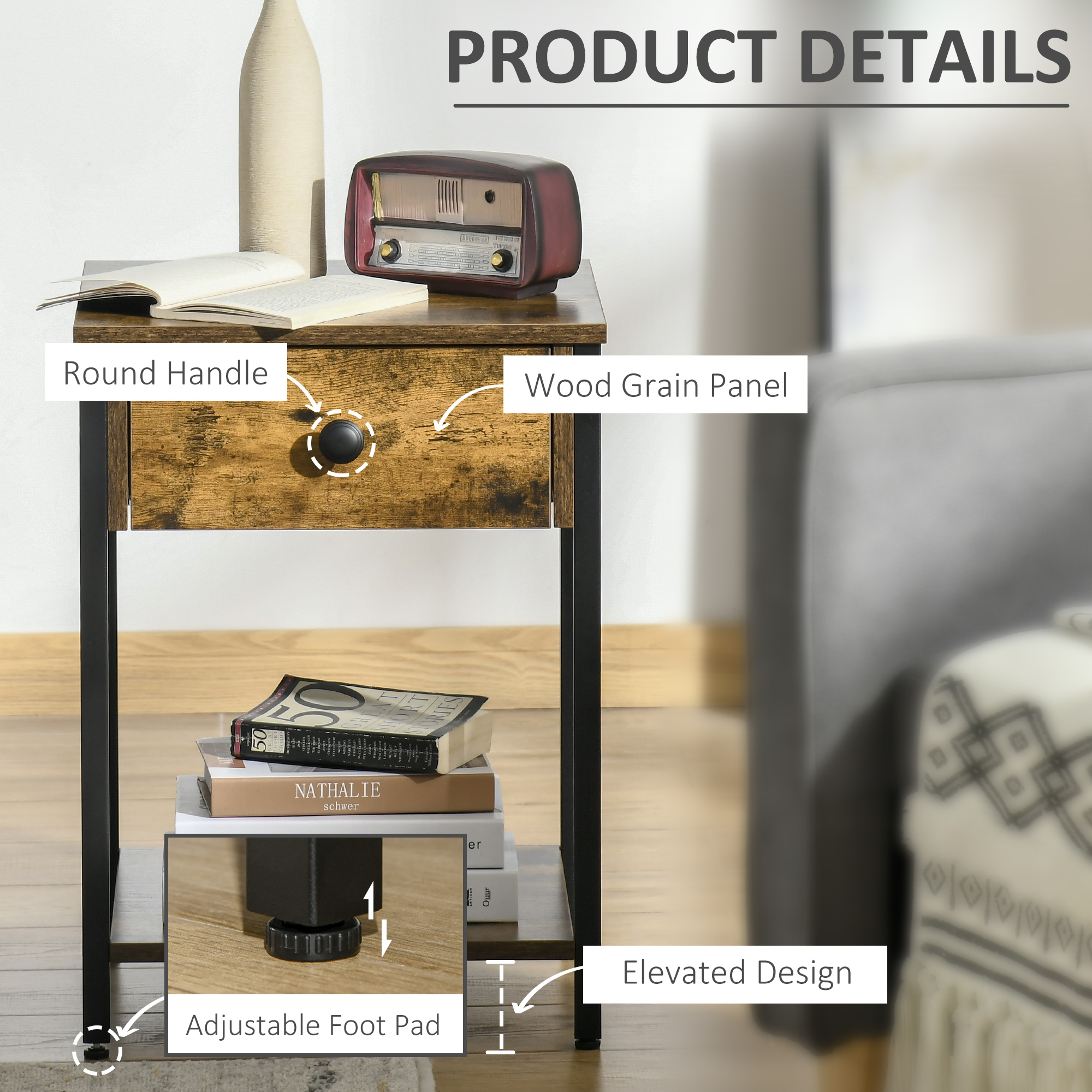 - Storage Space: with a tabletop, an open shelf, and a drawer with a round handle, this accent nightstand offers plenty of space for various household items, such as books, potted plants, or photos.
