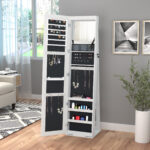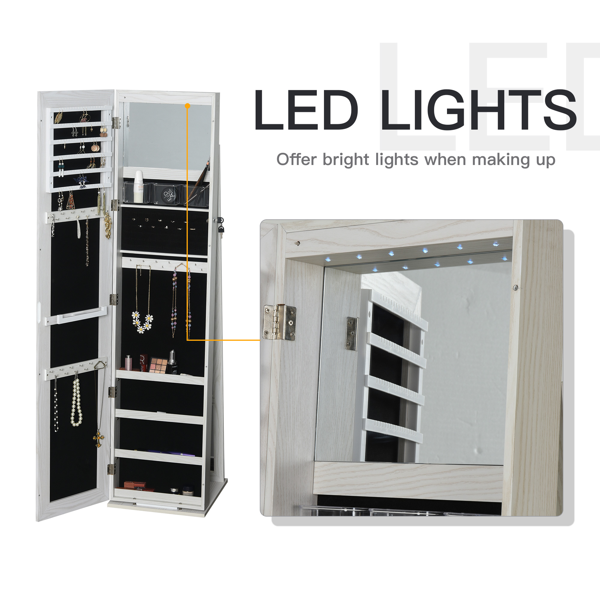 - LED-Lit Jewelry Armoire: Enhance your daily routine and elevate your jewelry organization with our exquisite jewelry armoire, now featuring LED lights for added convenience. This jewelry cabinet with a full-length mirror is designed to meet your needs and beautify your space.
