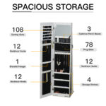 - Ample Storage Space: This jewelry cabinet is a multi-functional storage solution with much space to organize all your jewelry and beauty essentials. It features 108 earring slots, 24 necklace hooks, 78 ring slots, 1 bracelet hanger, 3 eyebrow pencil boxes, and 4 storage shelves. The interior is lined with quality material to protect your valuables from scratches and scuffs.