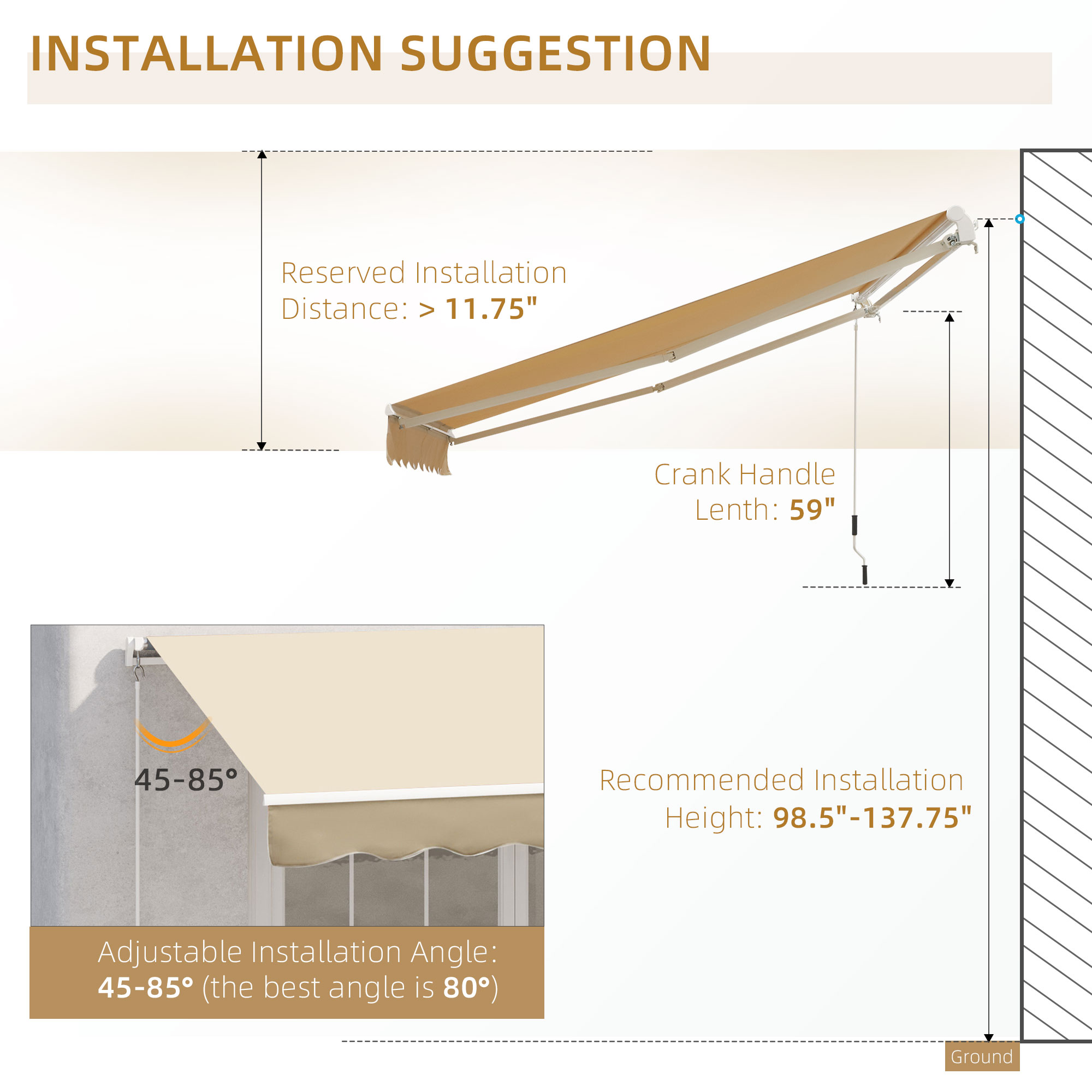 - Adjustable Protection: You can adjust the height of the extension arm on the telescopic rod by loosening the locking screw, allowing you to adjust the tilt angle from 45-85°, which can provide you with better shade according to different levels of sunshine, and the height of the deck awning ends can also be adjusted.