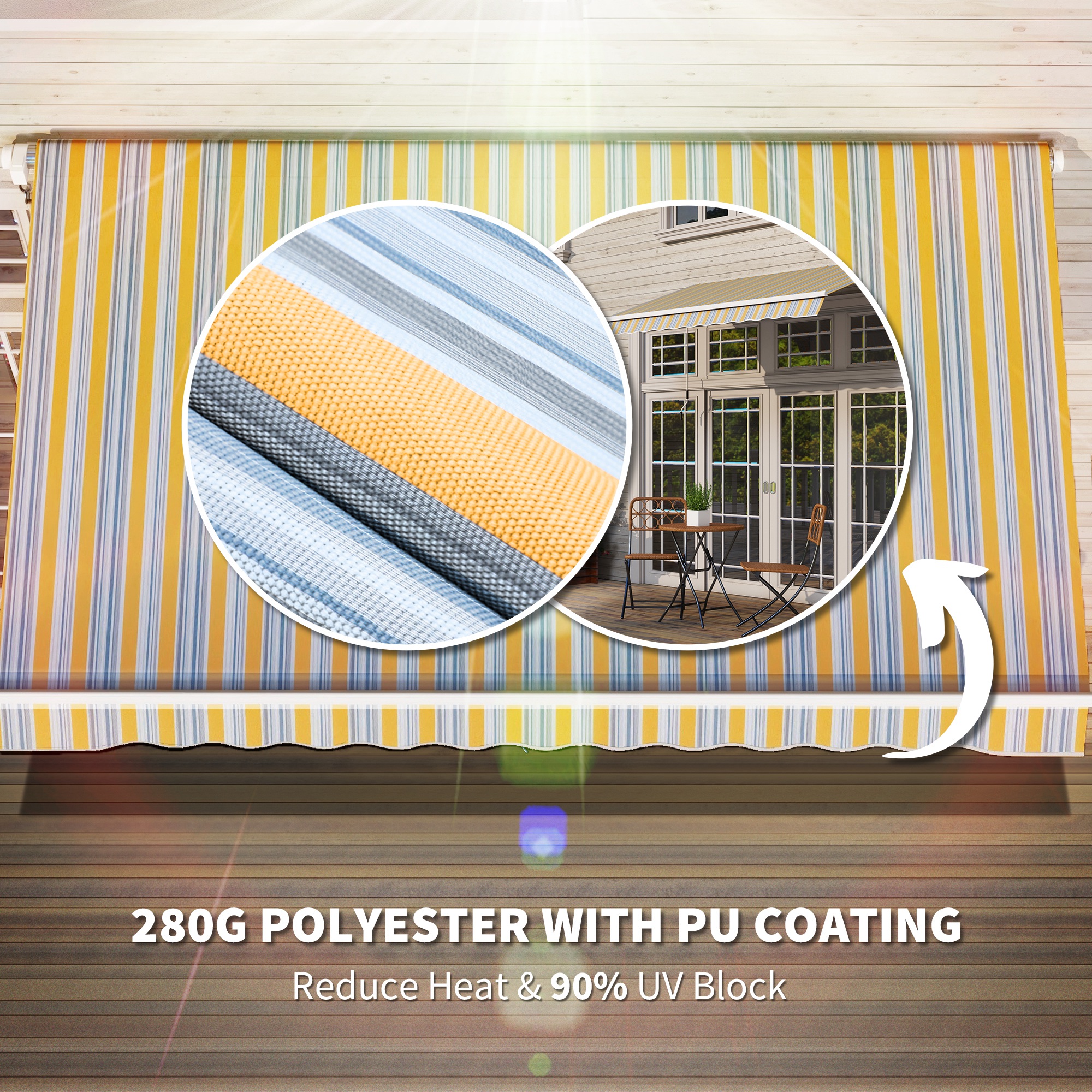 - Reduce Heat: The 280g polyester fabric with PU coating makes the door awning tough and resistant to UV. (Designed for sun protection and light rain, large amounts of rain can pool on the fabric and cause damage.)
