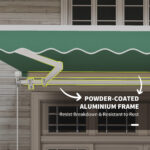 - Solid Design: This retractable awning features a robust construction comprising an aluminum and steel frame, with steel square tubes enhancing stability. The powder-coated aluminum frame, while lightweight, ensures durability and resistance to breakdown for extended longevity.