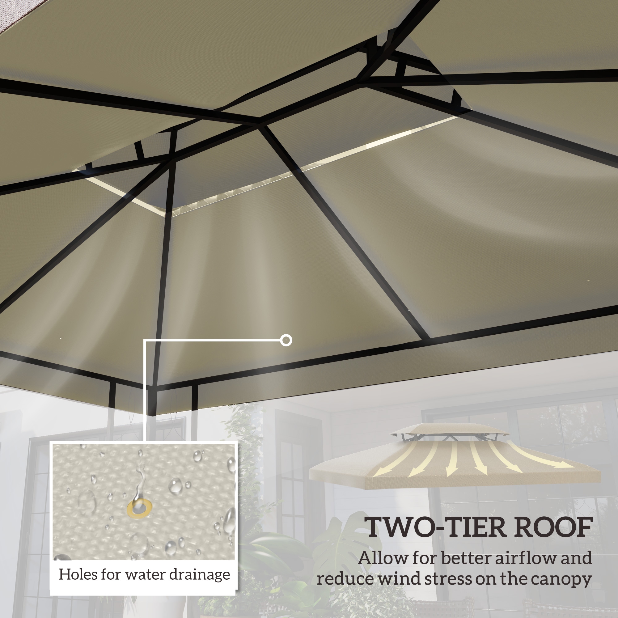 - Two-tire Roof: With double tired roof design, this universal canopy cover replacement allows proper airflow inside to keep you cool. Also features ten holes for water drainage