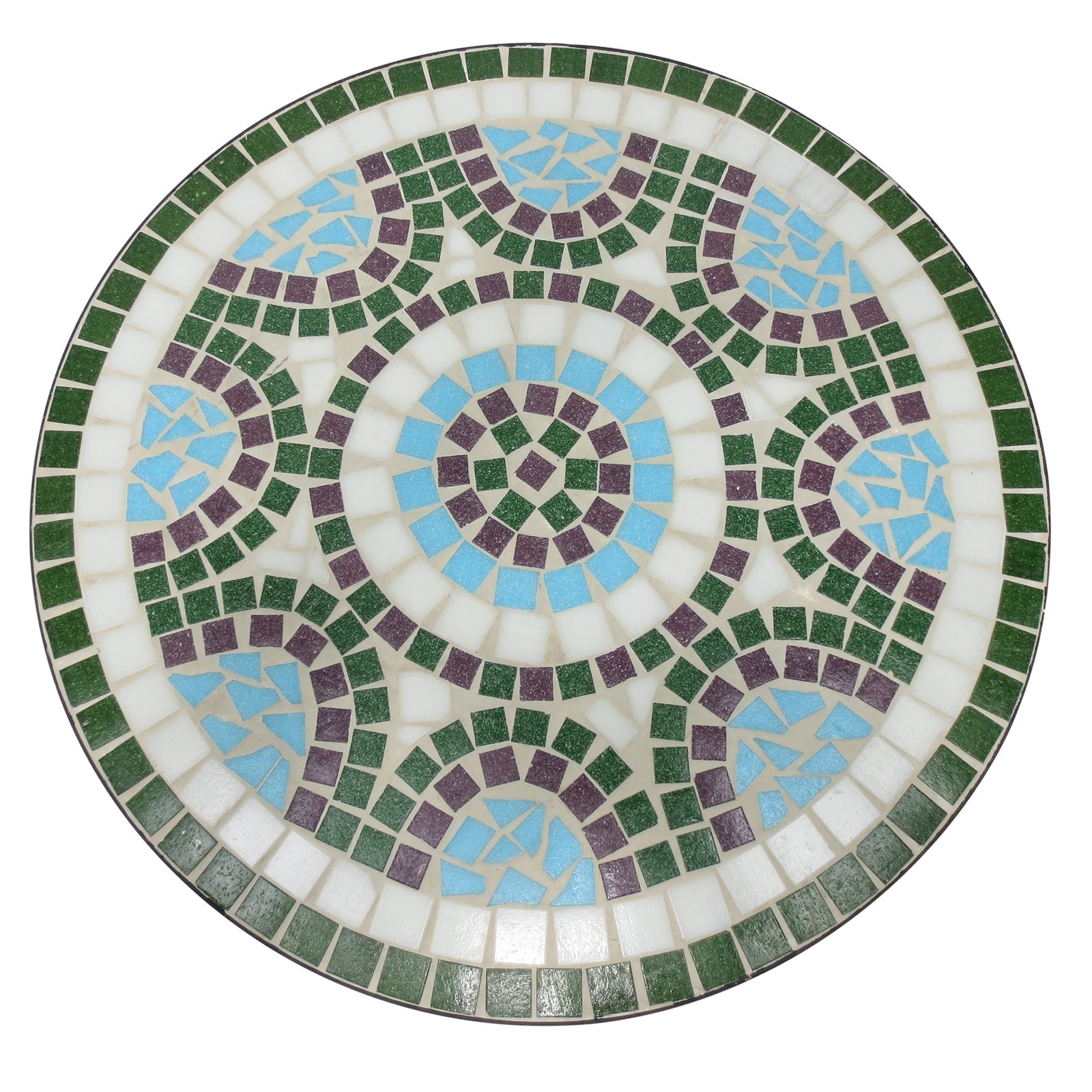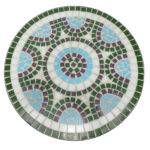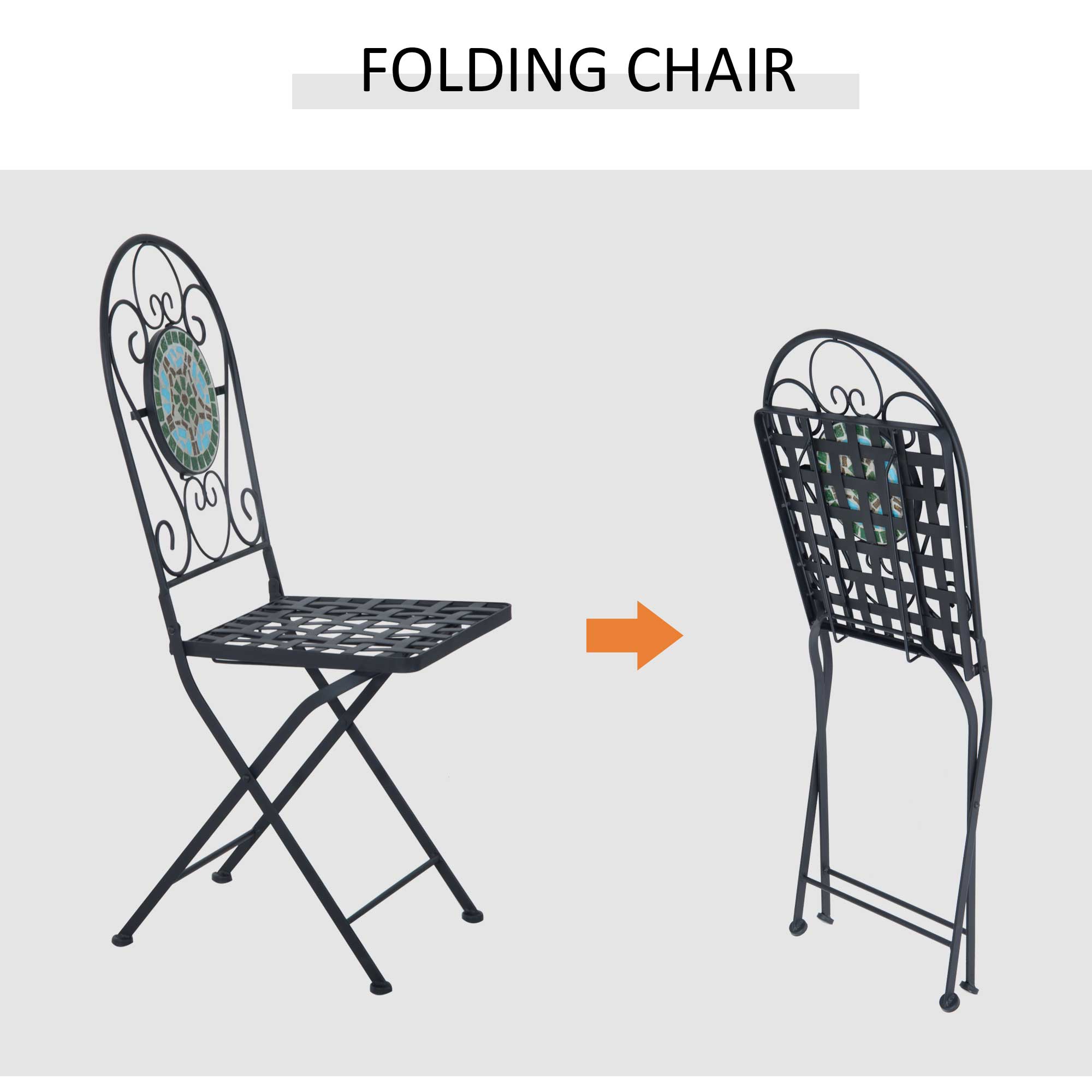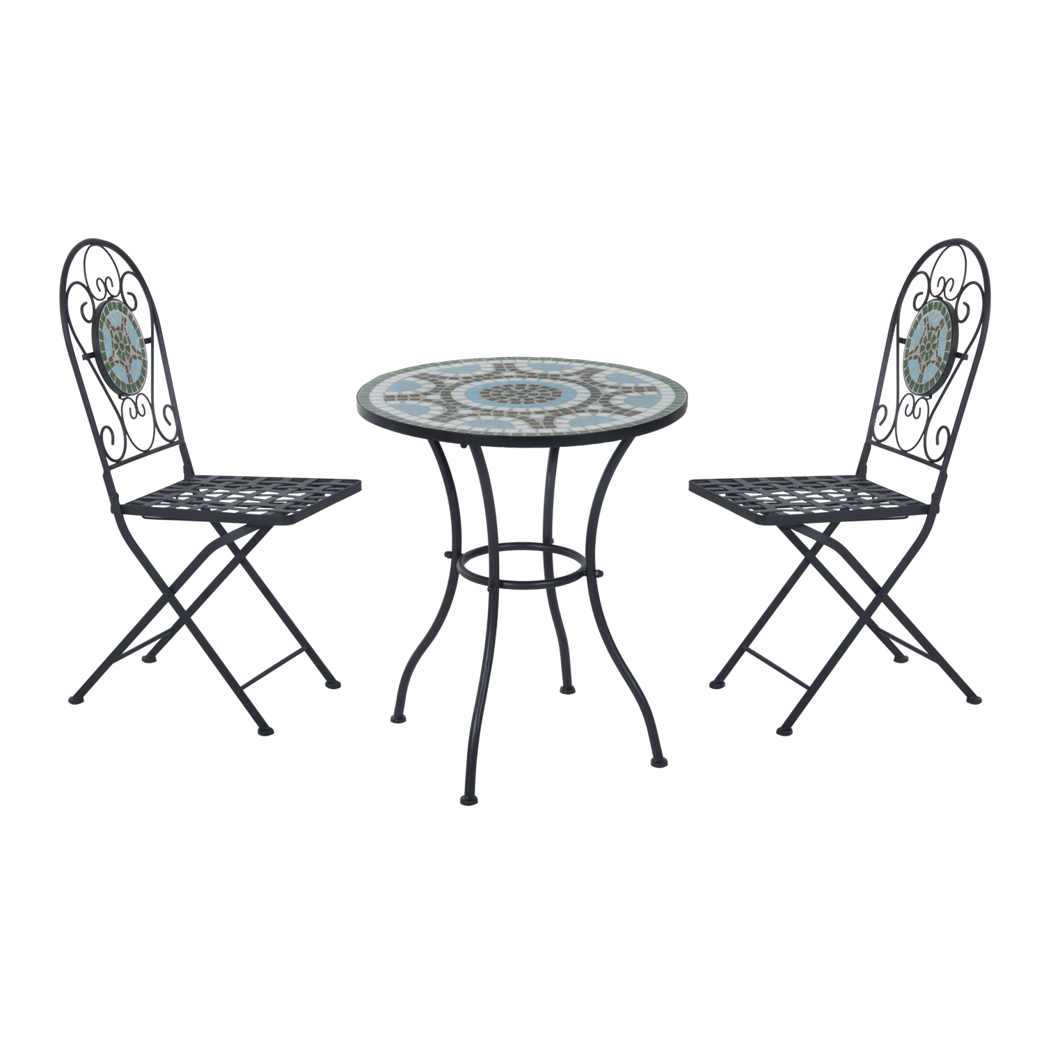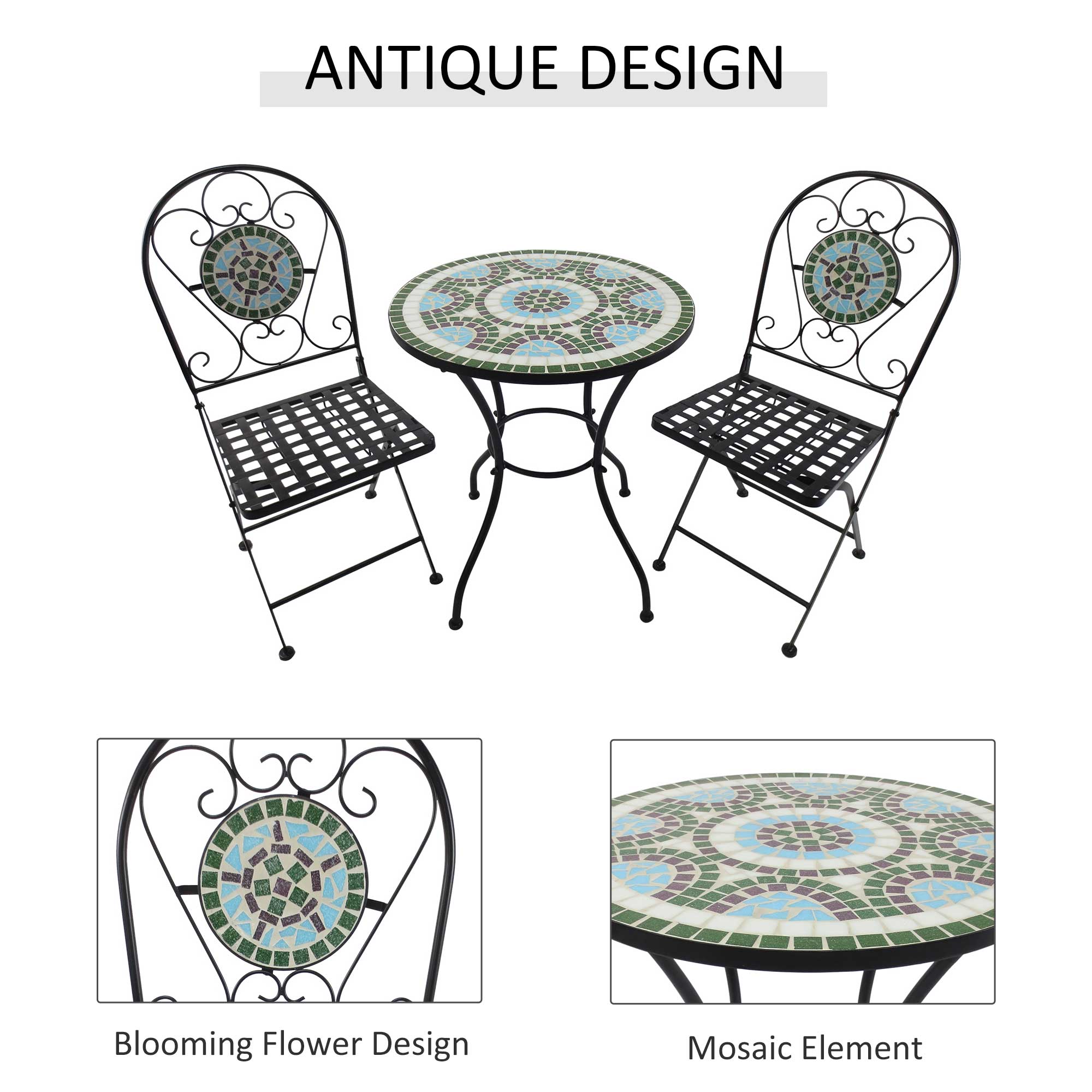 - 3-Piece Mosaic Set: This elegant 3pcs patio furniture set includes two folding iron chairs with tile detail and a single round iron table with ceramic tiles encompassing the entire table-top and forming a beautiful design. Features a Spanish-inspired tile pattern in bright colors to be enjoyed by everyone.