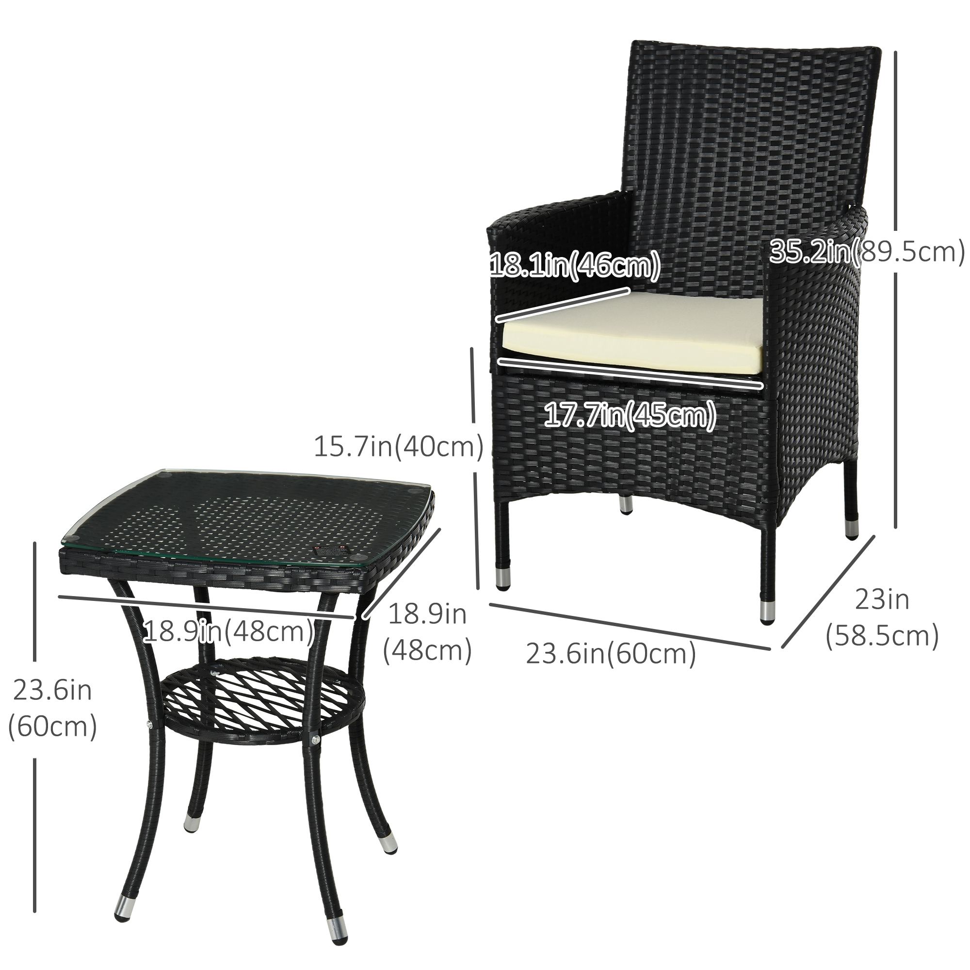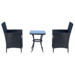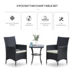 - Wicker Bistro Set Dimensions: Chair Size: 23.5″W x 23″D x 35.25″H, Coffee Table Size: 19″W x 19″D x 23.5″H, Weight Capacity: 264lbs(armchair), 110lbs(tea table).