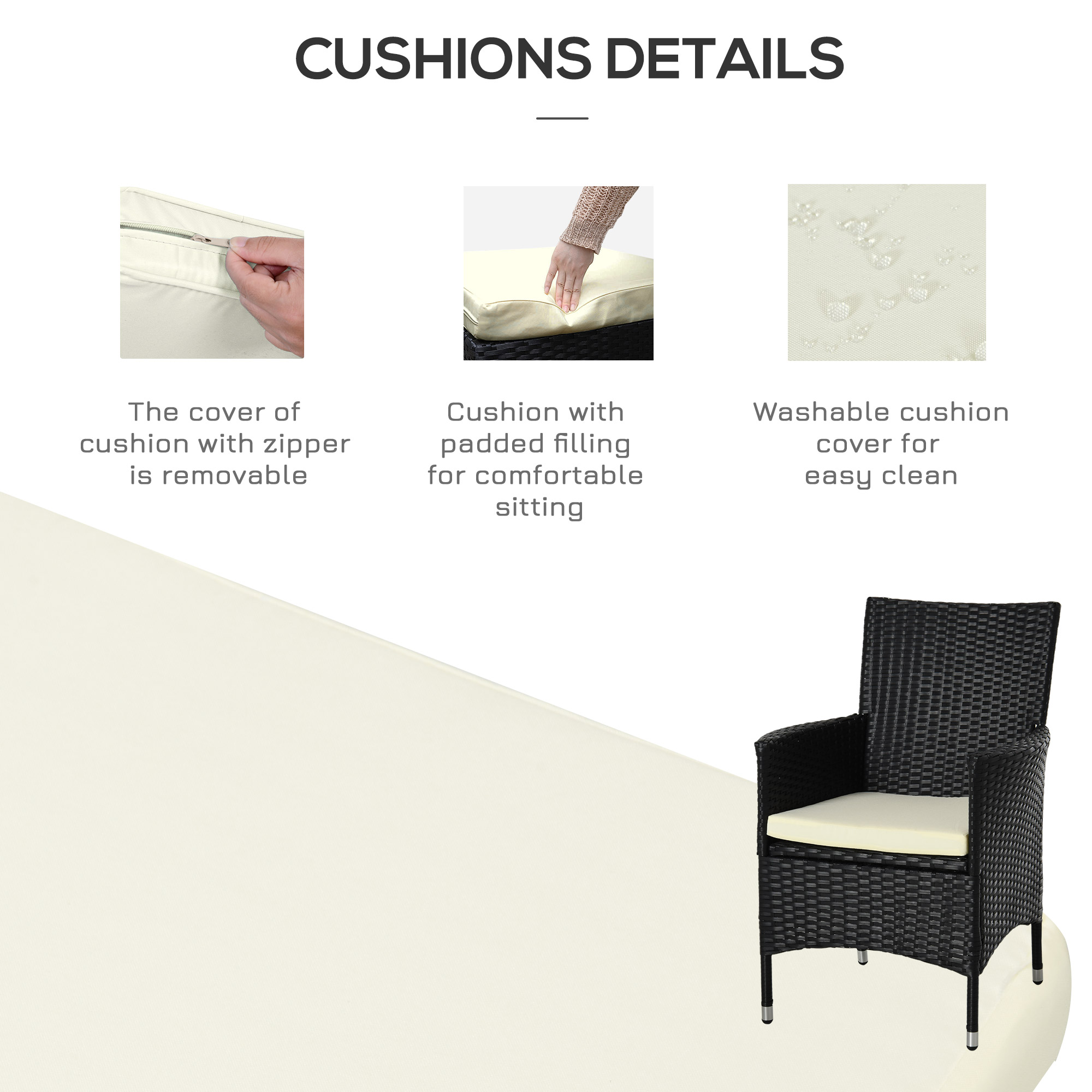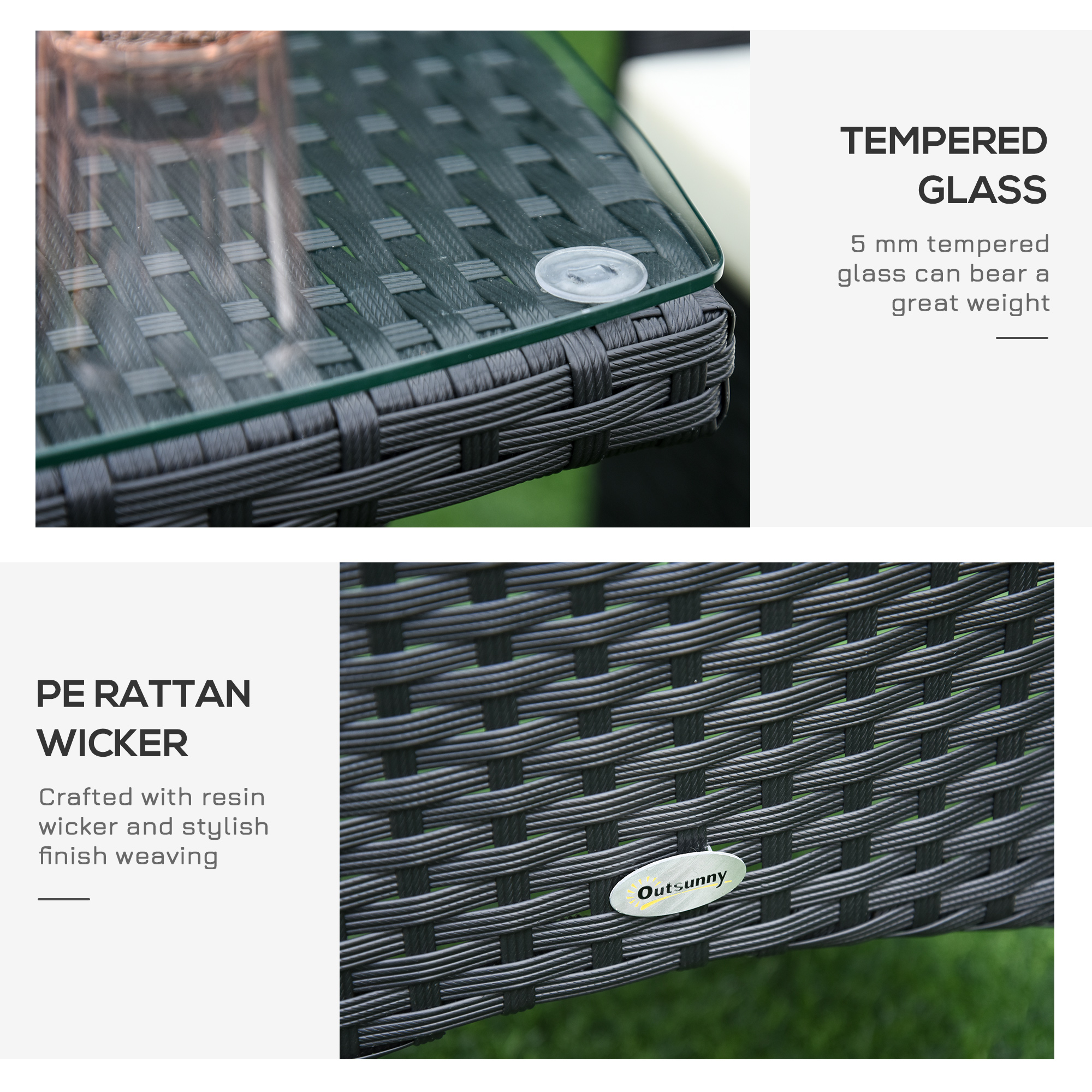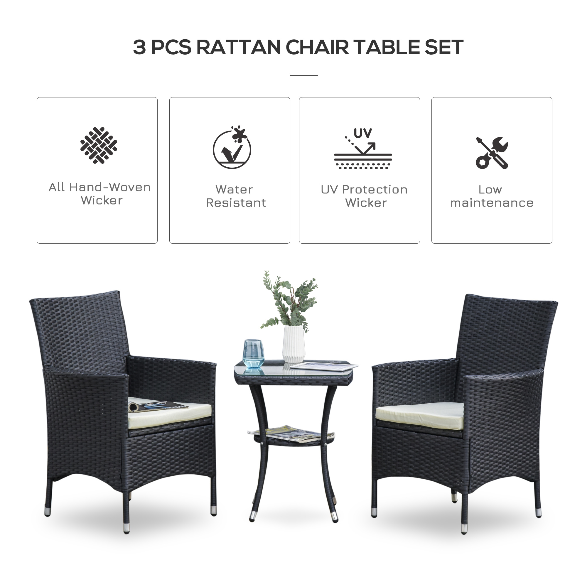 - Tempered Glass Tabletop: This small space patio furniture include a matching table with tempered glass top and a lower shelf, easy to clean and maintain, adds a sophisticated look to outdoor dining.