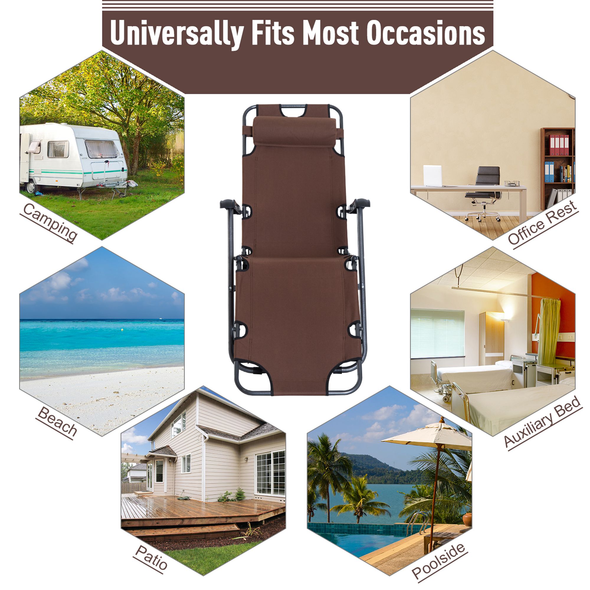 - Yard Chair Adjustable: 2-Level adjustable backrest makes this folding lounge chair can transform from reclining lounger to a cot within seconds for different needs