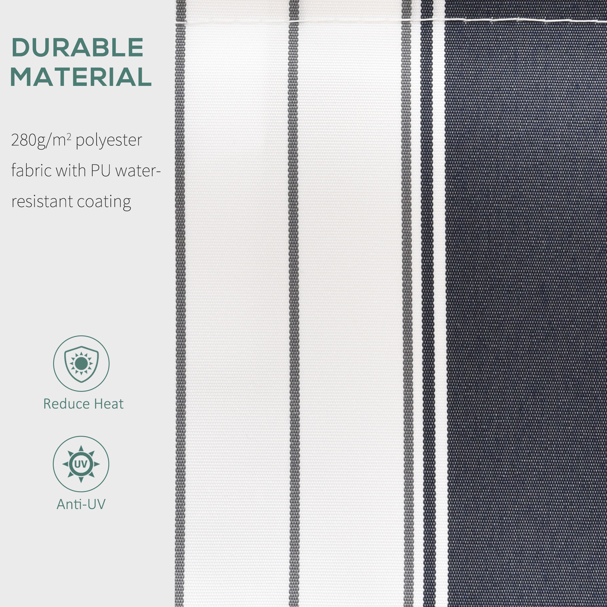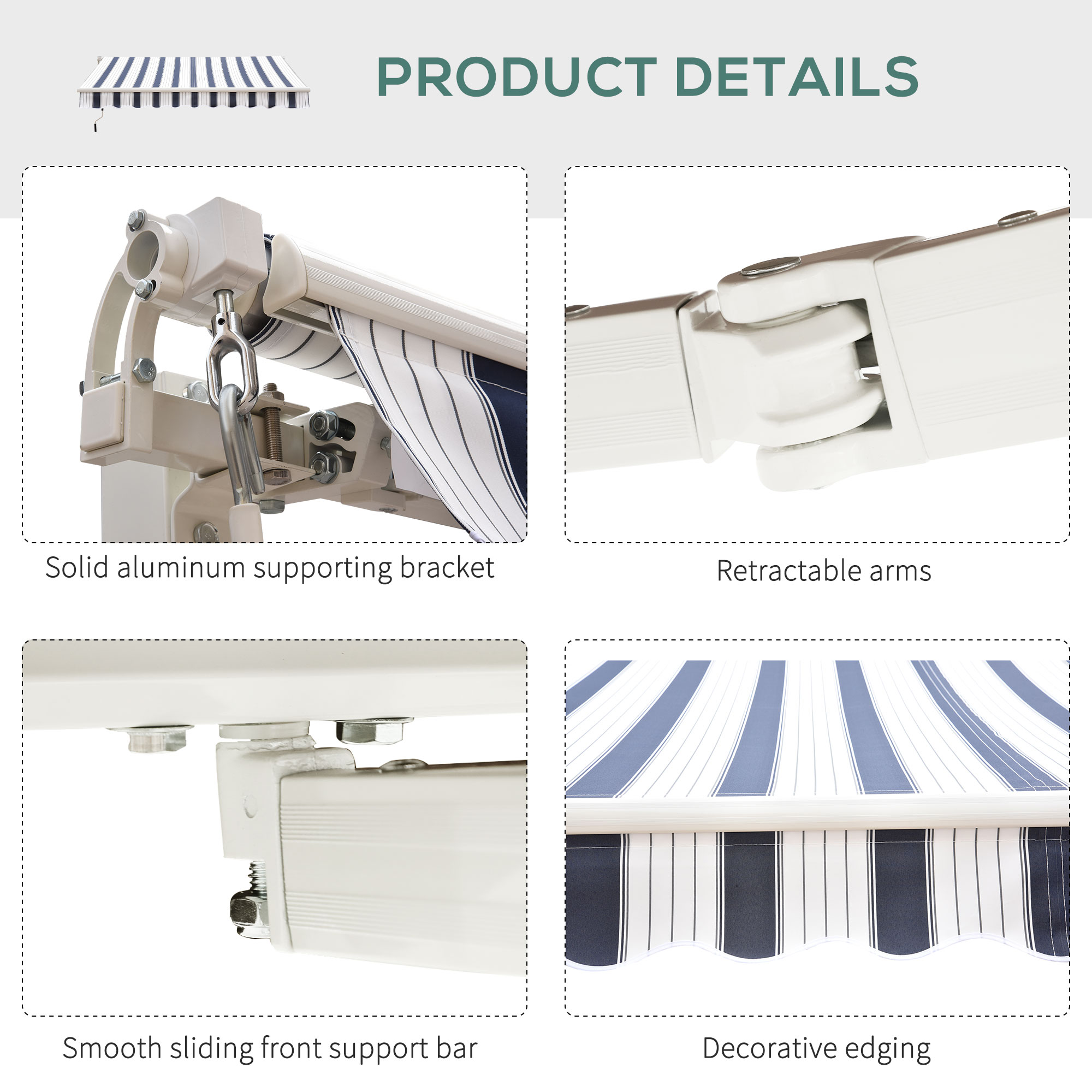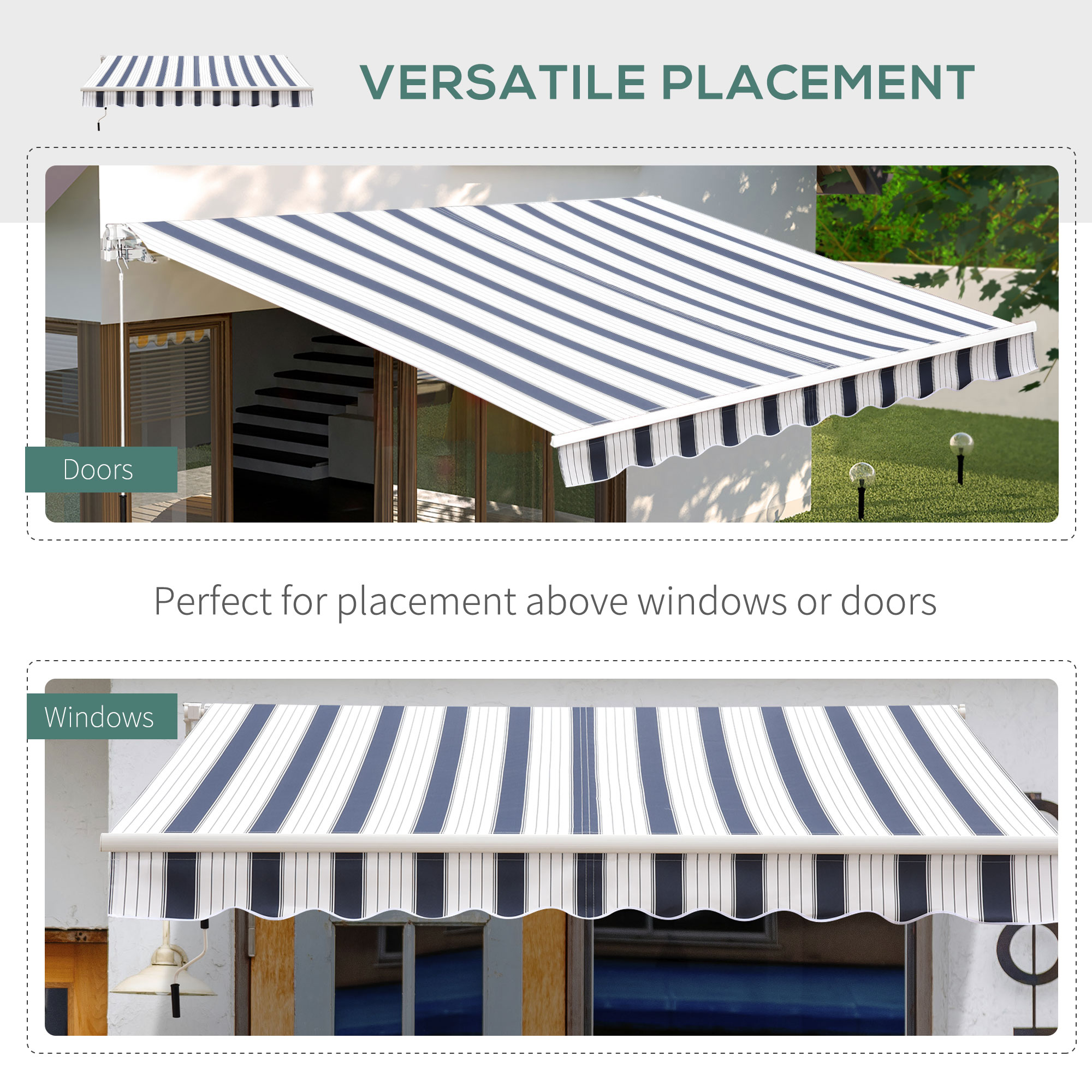 - Versatile Placement: This door awning is great for placement above windows or doors. The simple colour of the manual retractable awning provides a clean and consistent look.