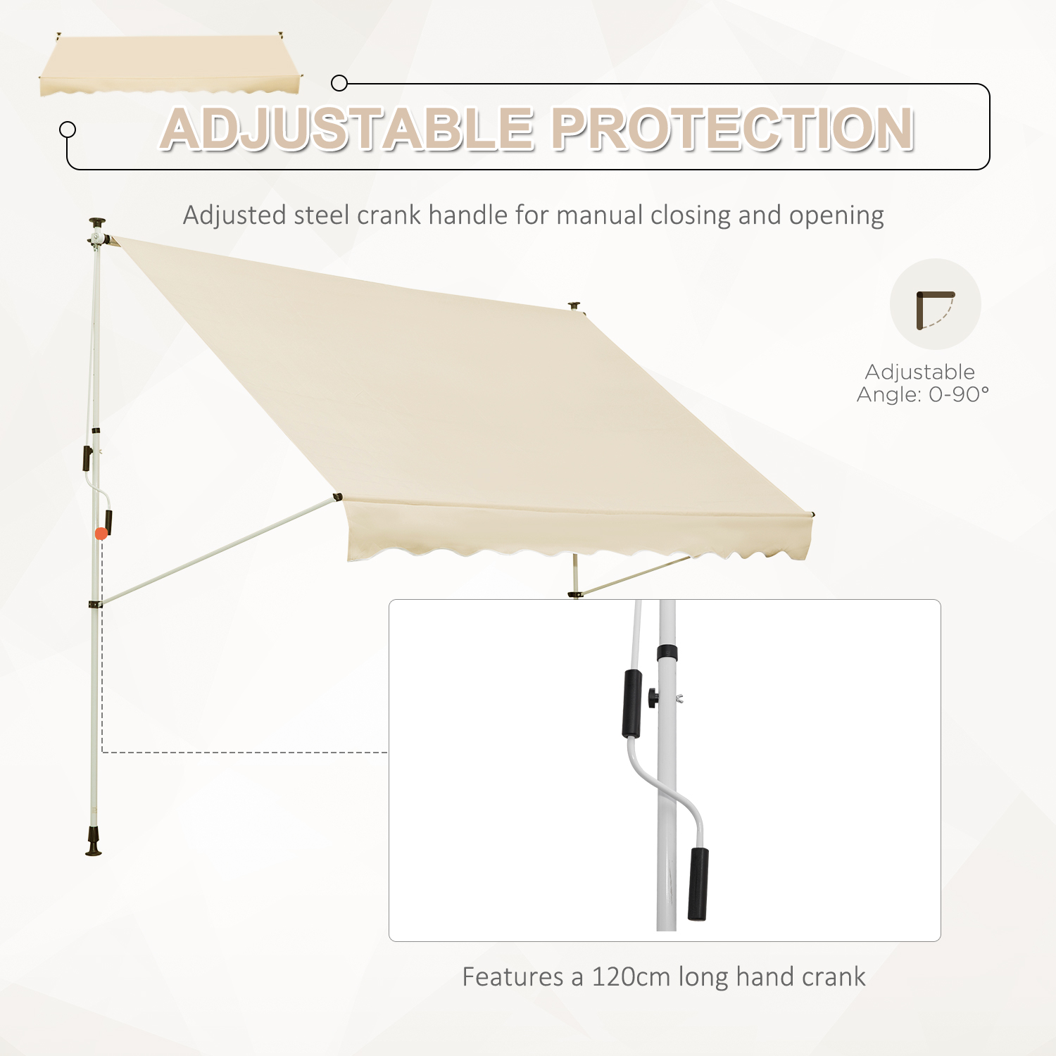 - Adjustable Canopy: This door awning features a 47.2″ (120cm) long hand crank that opens the awning smoothly and quietly to adjust 0-90° to meet your sun or shade needs.
