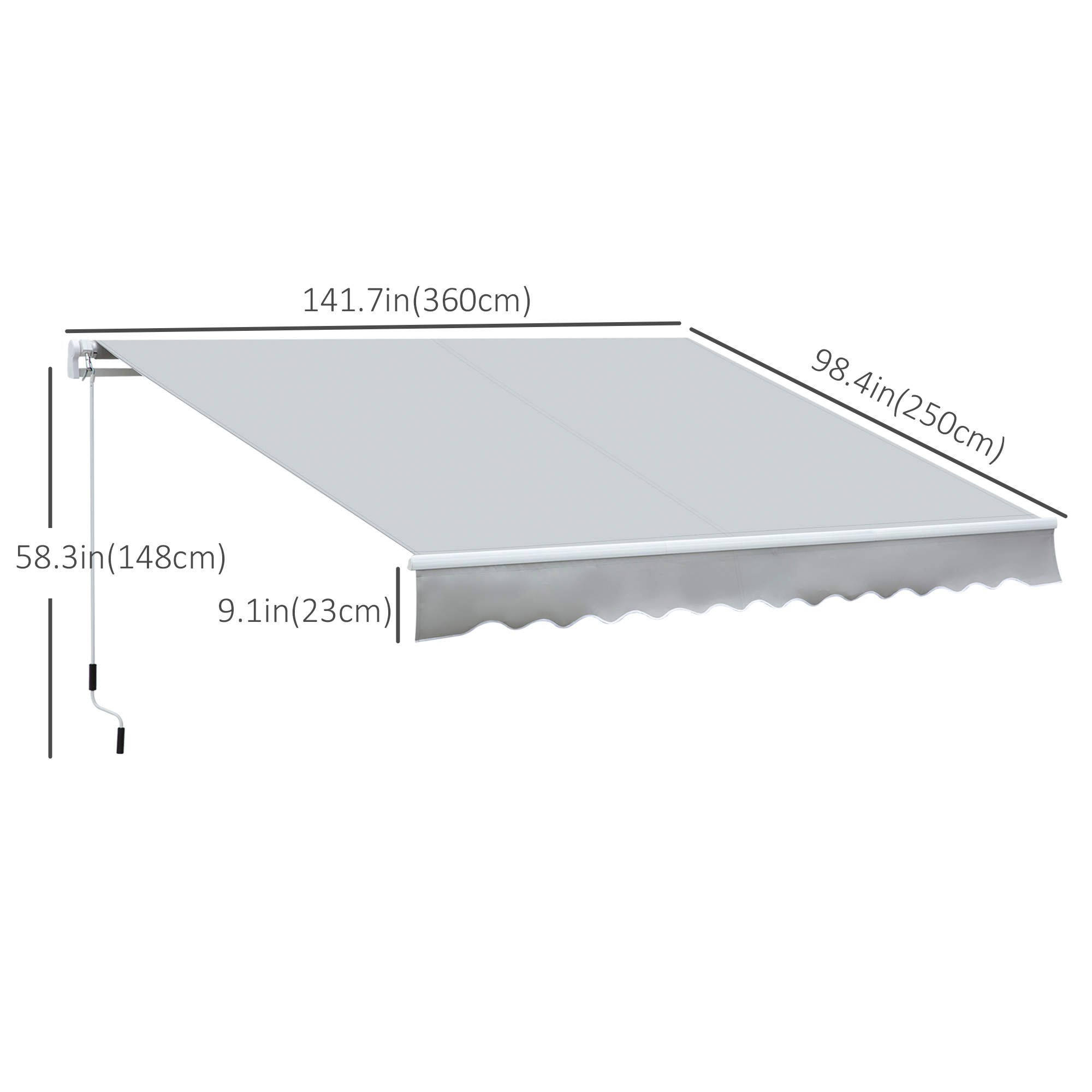 - Awning Info: Shaded Area: 11.8’L x 8.2’W (360L x 250Wcm), 96 ft² (8.57 m²). Assembly and installation required. Recommended to be installed 8.2′- 11.5′ (2.5-3.5m) above the ground. Note: Large amounts of rain can collect on the fabric and cause damage, so please take it back on a rainy day.