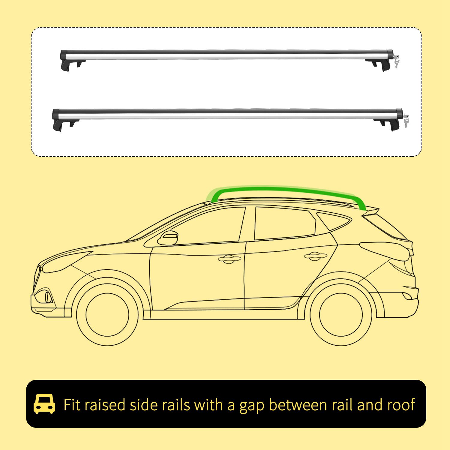 - Fit 2 Car Roofs: 2-piece cross bar roof rack is a great addition to your outdoor vehicle travel, suitable for roof rack which has a certain space between the rail and the roof. If there is no space between the rail and the roof, but there are grooves or slopes outside, it also works.