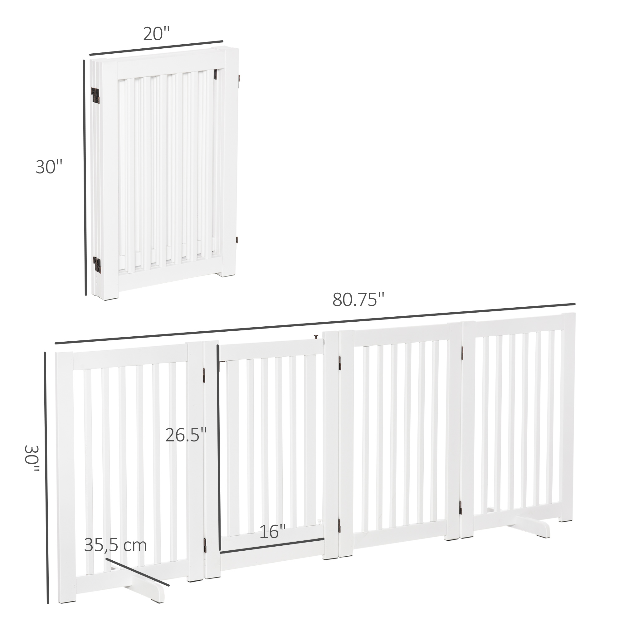 - Dimension: Expanded Overall Dimension(with support feet): 80.7″ L x 14″ W x 29.9″ H (205 x 35.5 x 76 cm). Single Panel Size: 20.1″ L x 29.9″ H x 0.7″ D (51 x 76 x 1.8 cm). Slat spacing: 1.6″(4cm). Suitable for small to medium-sized dogs up to 19.7″(50cm), not suitable for dogs that are too strong or like to jump to avoid knocking over the door bars.