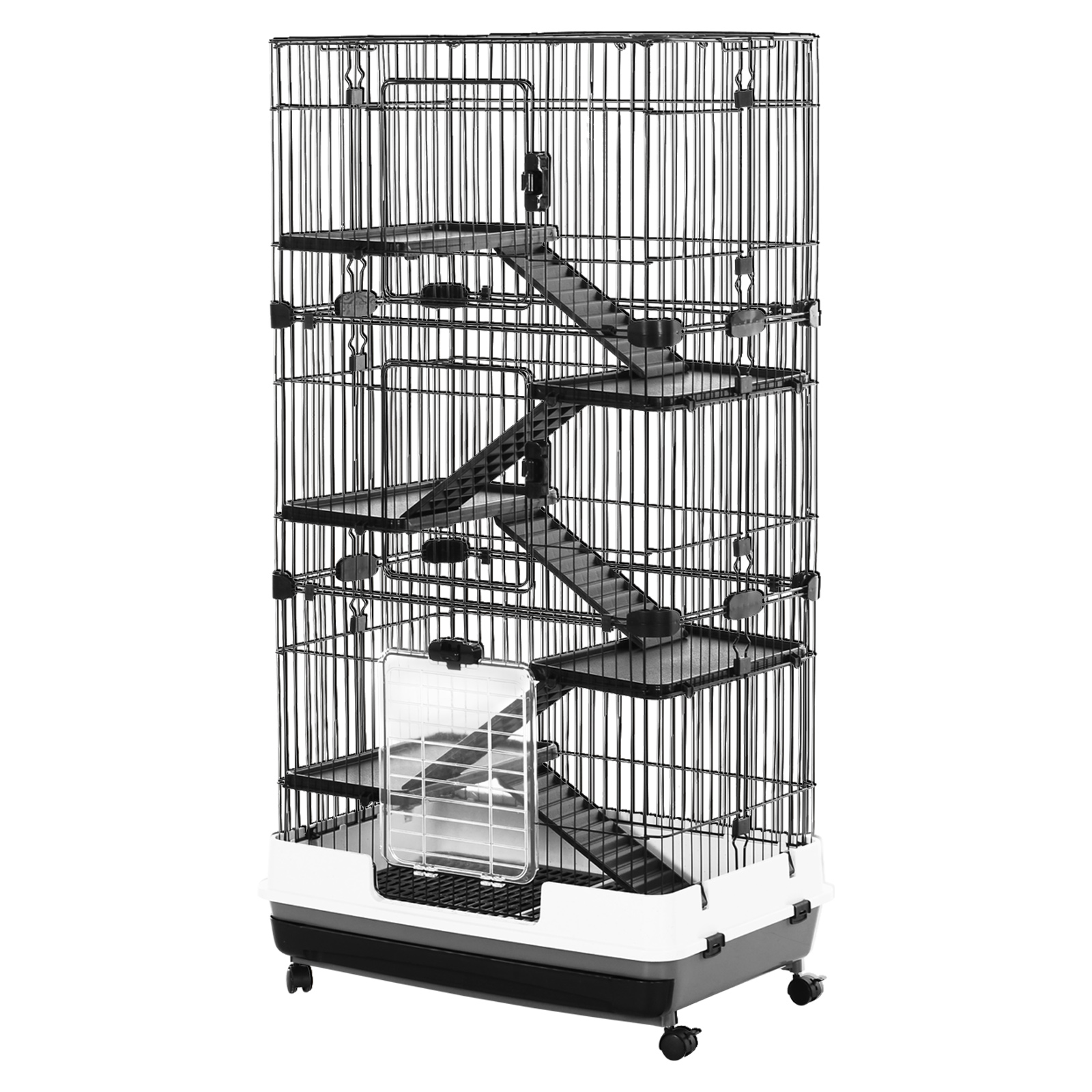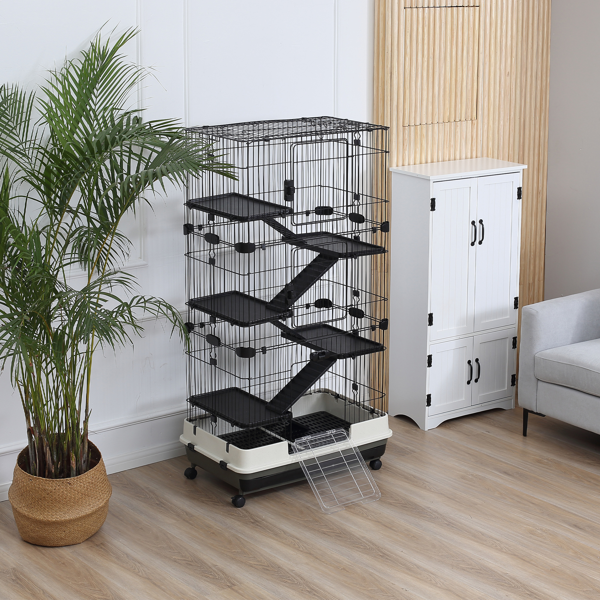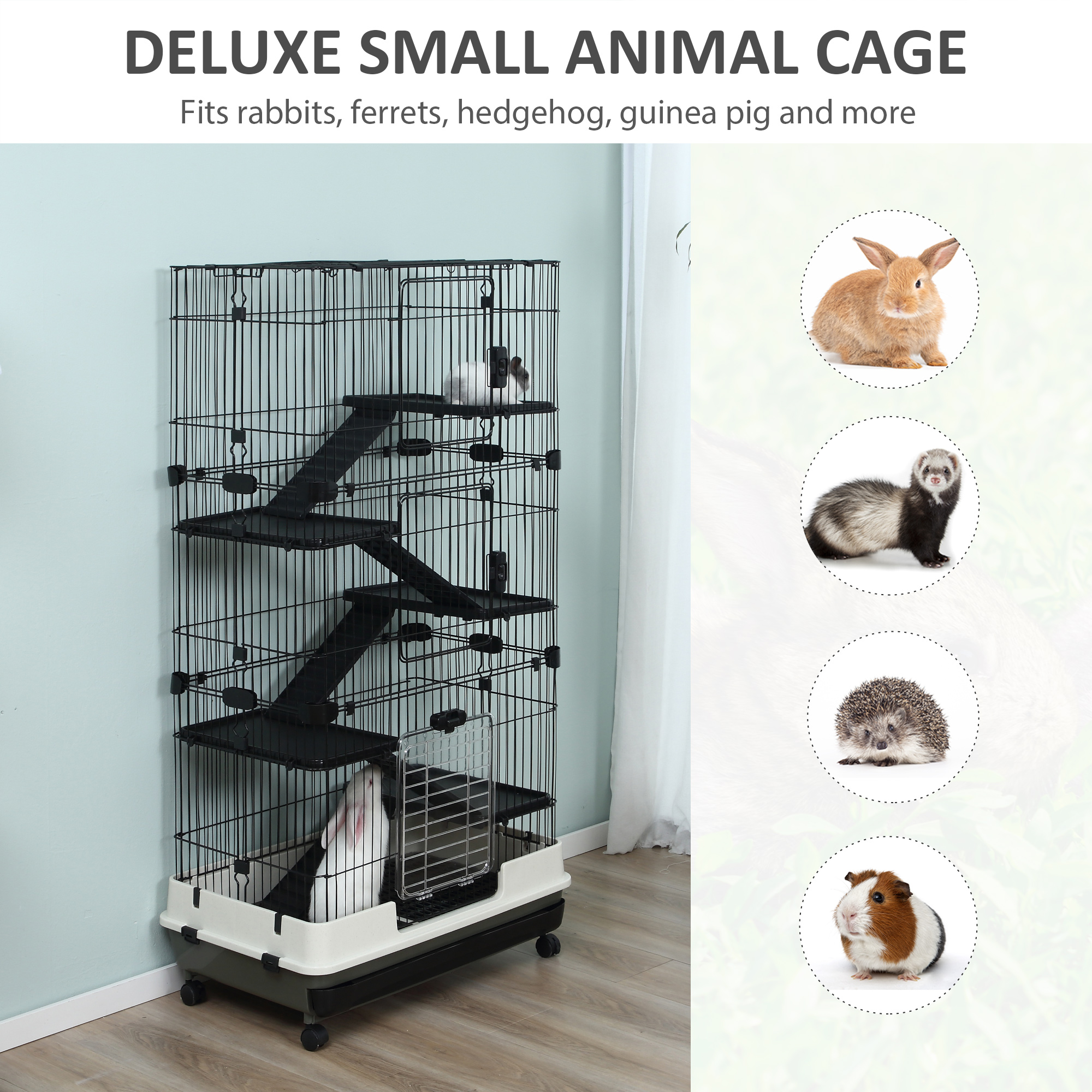 - Deluxe Animal Cage: This wheeled indoor fancy 6-level habitat in beautiful black and white colors is great for your small pet to live.Ideal for small pet of large size such as rabbits, pet mink, chinchillas, etc. Note: Not suitable for hamster and rat.