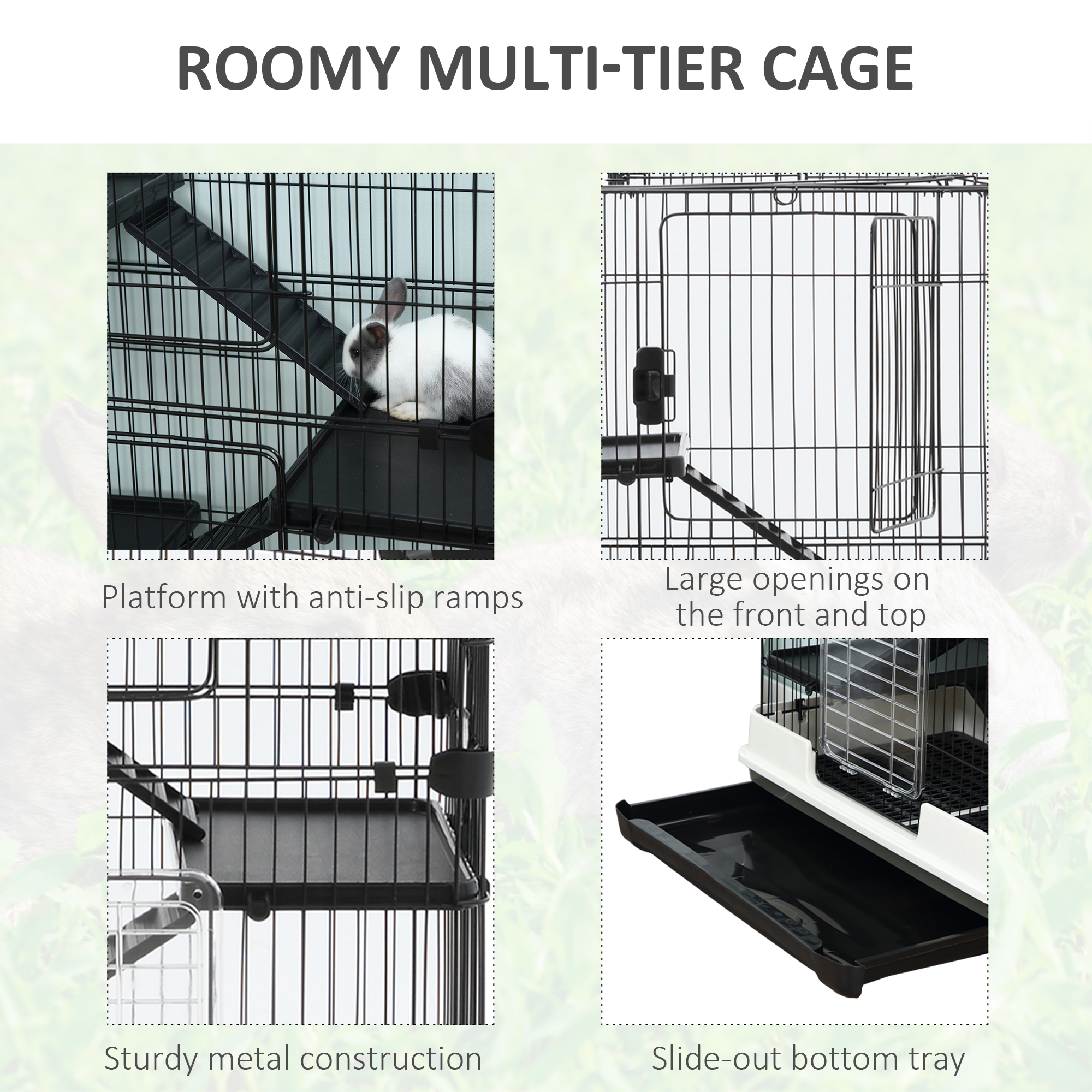 - High Quality Materials: Our small animal cage is made using a sturdy metal frame with 0.13″(3.2mm) and 0.17 “(4.2mm) wire and a fully painted surface to make it wear and corrosion-resistant. Thoughtful narrow bar spacing avoids your animal getting stuck.