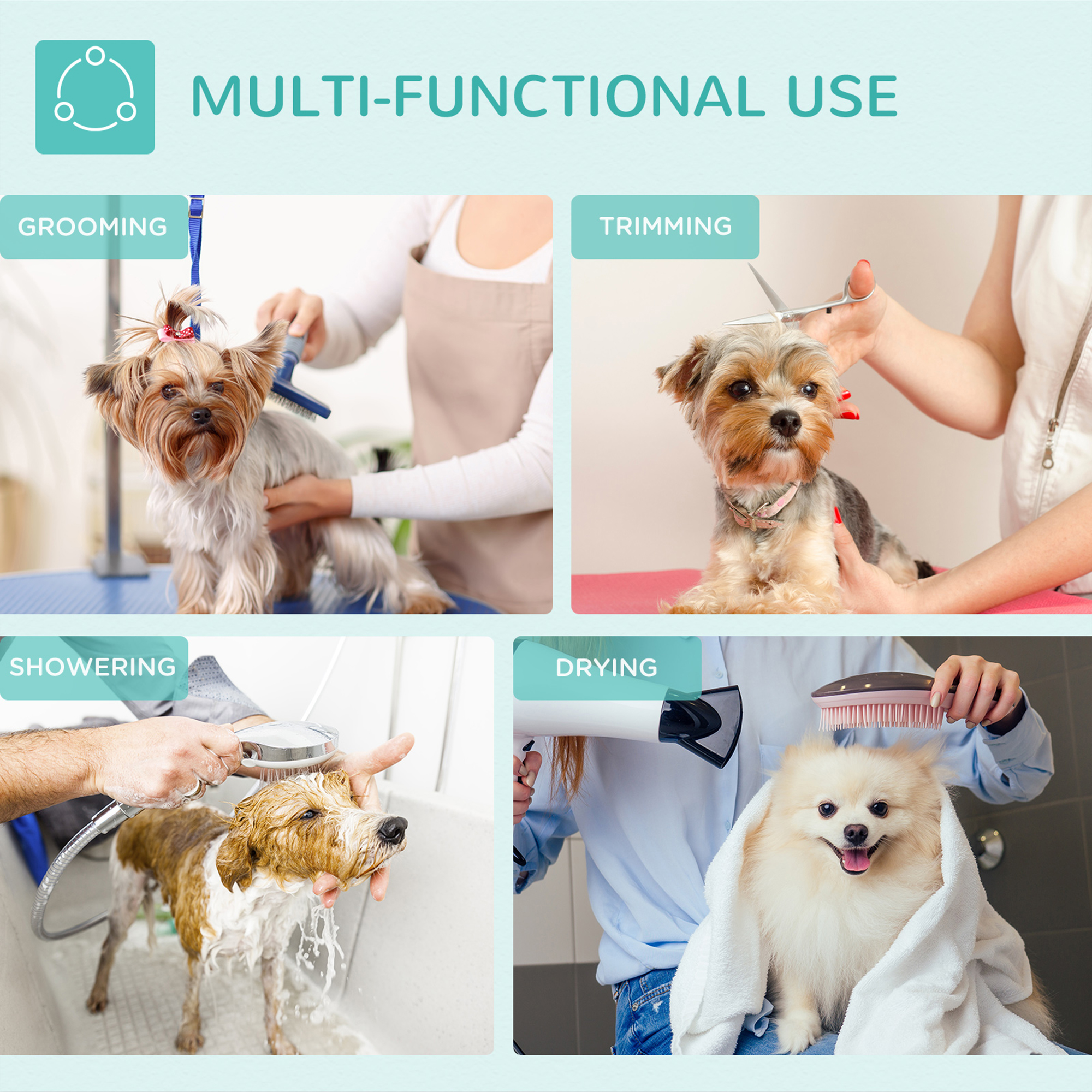 - Grooming Table: This pet grooming table with robust metal frame construction in powder coating, stable and rust-resistant. The noose is included to keep pets in place while you bathe, dry, brush, clip and trim.