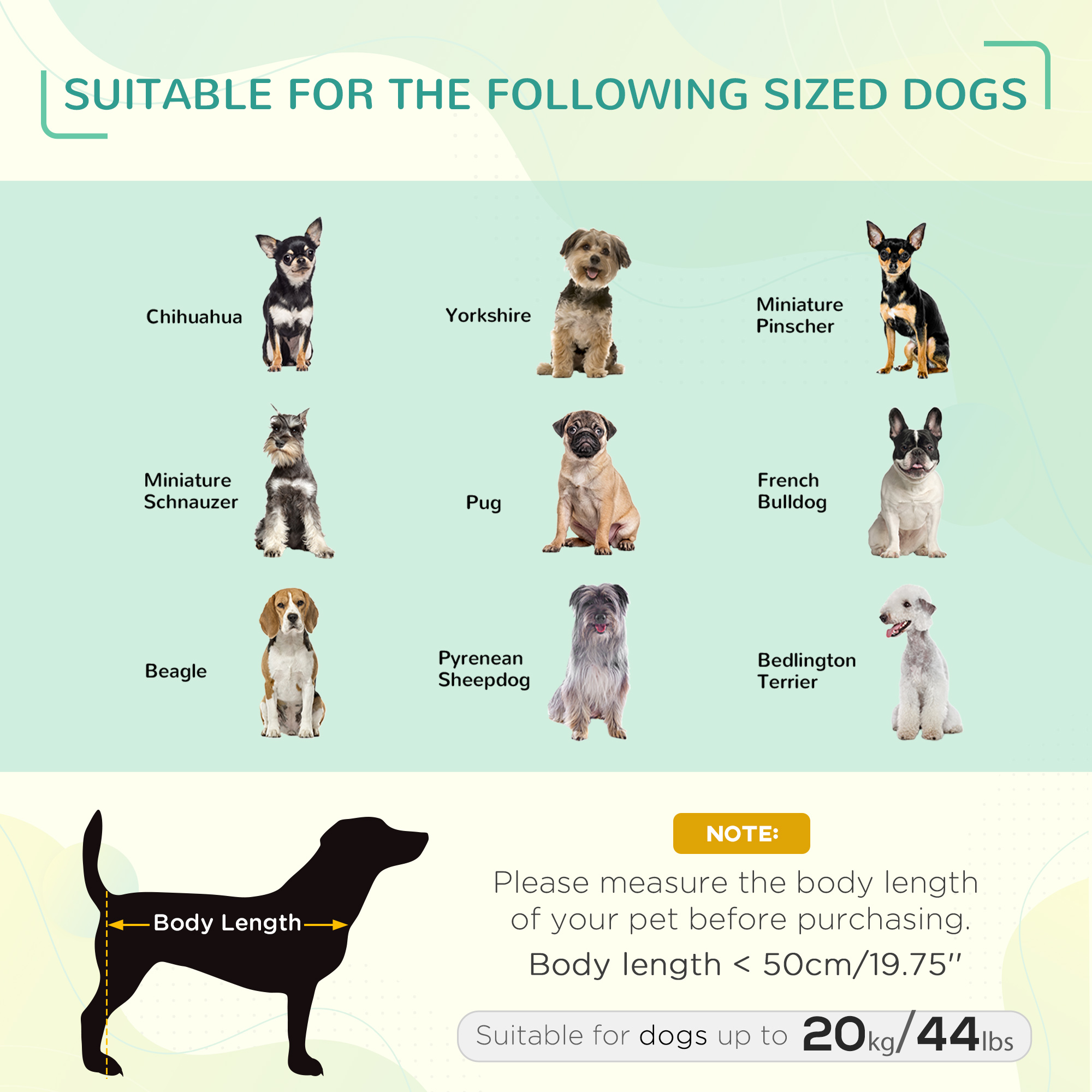 - Pet Cot Overall Dimensions: 29.9″ L x 24″ W x 7.1″ H (76 x 61 x 18 cm). Mesh Insert Size: 18.5″ L x 13.8″ W (47 x 35 cm). Suitable for medium dogs less than 19.7″ (50 cm) in length and under 44 lbs (20 kg) in weight.