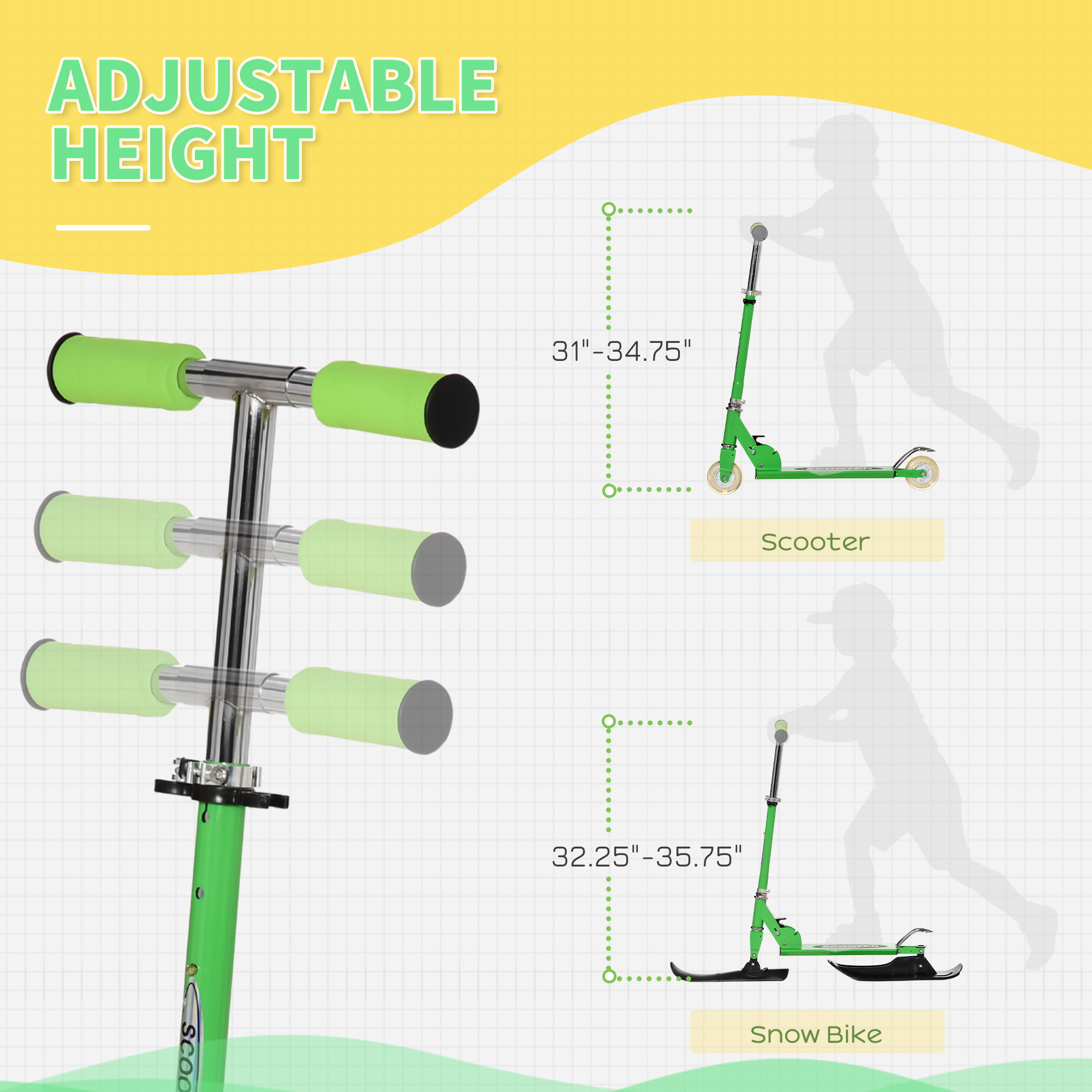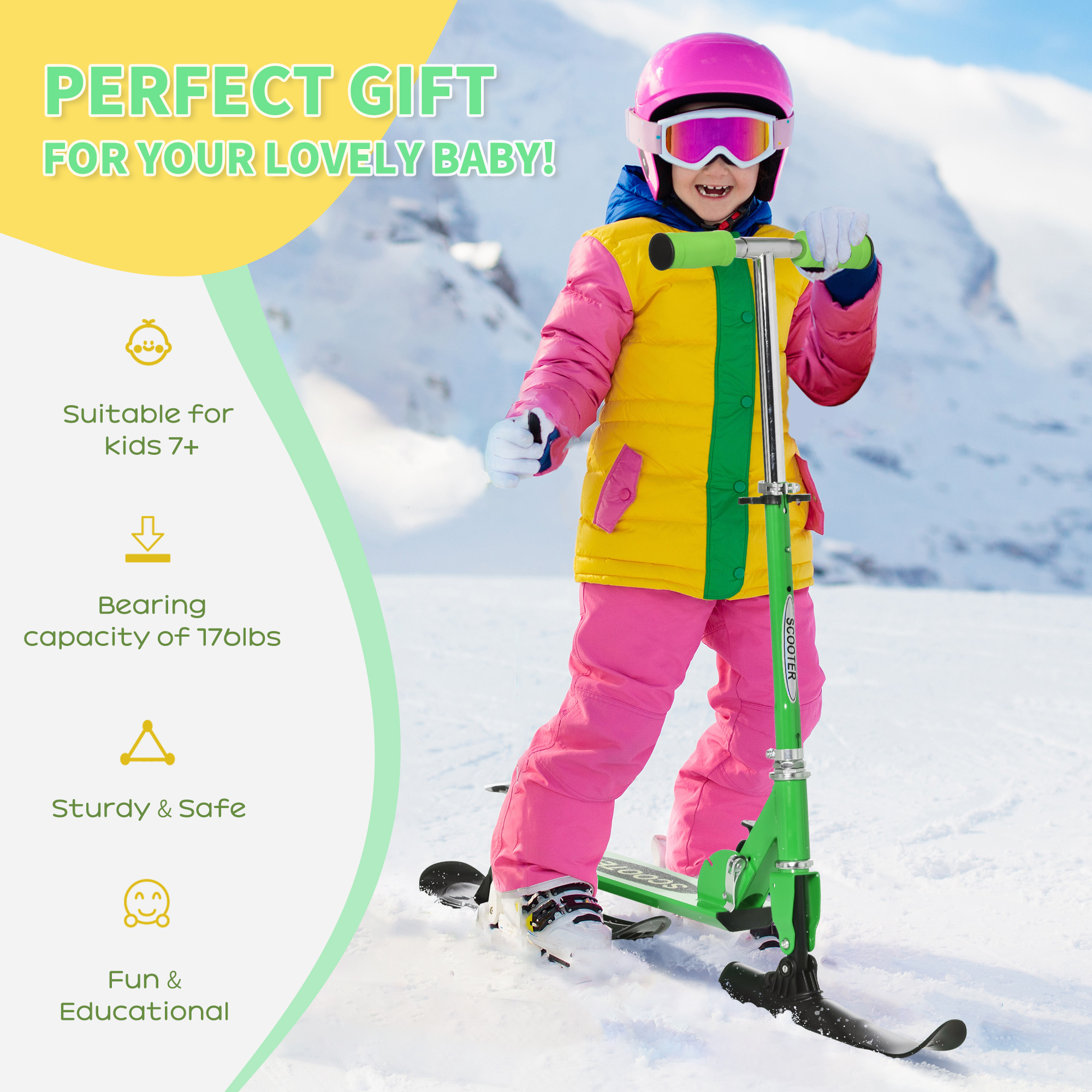 - Adjustable Height: No need to worry about finding the ideal fit. Our snow scooter for kids features an adjustable height, allowing kids to enjoy a comfortable and customized riding experience.