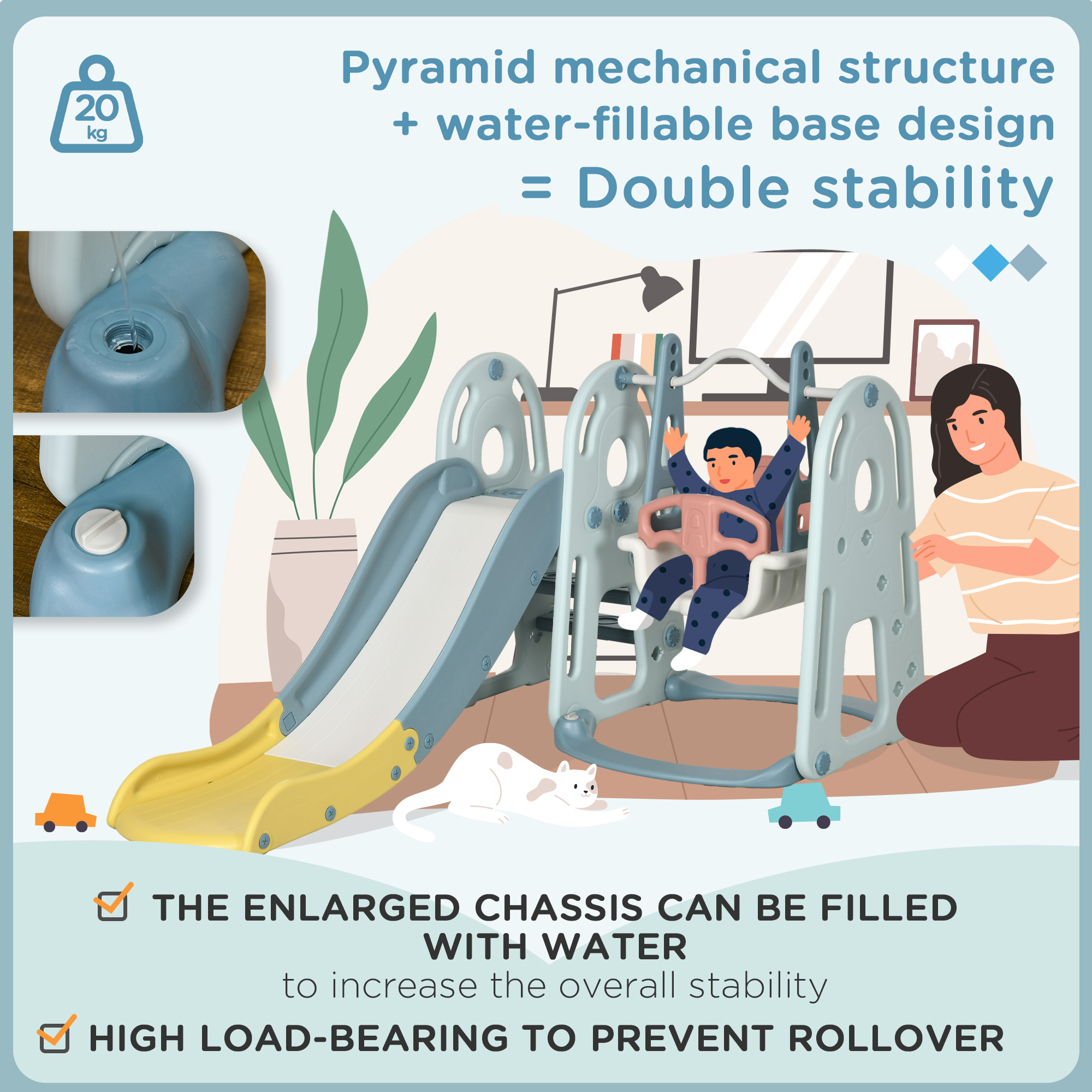 - Stable Kids Slide: Keep your kids safe while they play! The kids slide includes a water-fillable base, anti-slip & textured steppers, a buffer zone for added safety and a wide slide track with rails to keep your sweetie stable as they slide.