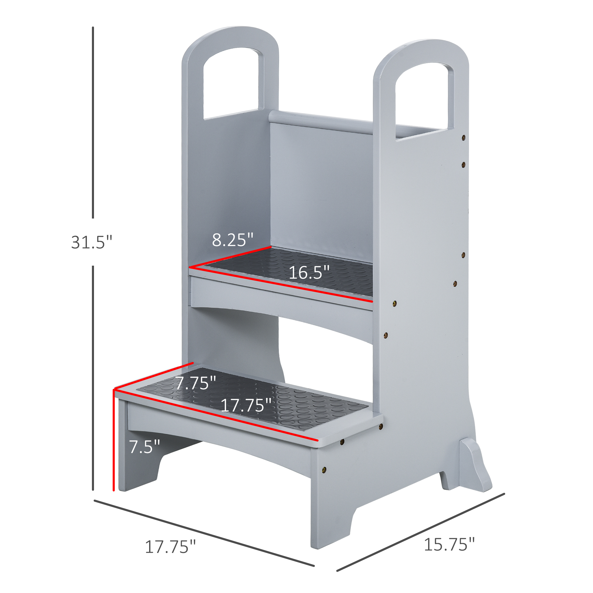 - Kitchen Step Stool Dimensions: Overall Dimension: 17.7″ L x 15.7″ W x 31.5″ H (45 x 40 x 80 cm). Suitable age: 3-8. First Step Size: 17.7″ L x 7.7″ W (45 x 19.5 cm). Second Step Size: 16.5″ L x 8.3″ W (42 x 21 cm).