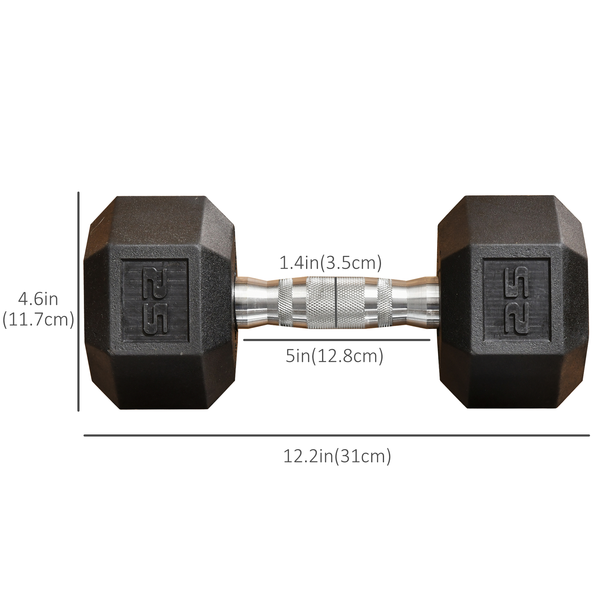- Weights Dumbbells Dimensions: Overall Dimension: 12.25″L x 5.25″W x 4.5″H, Weight: 50 lbs/set, 25 lbs/single