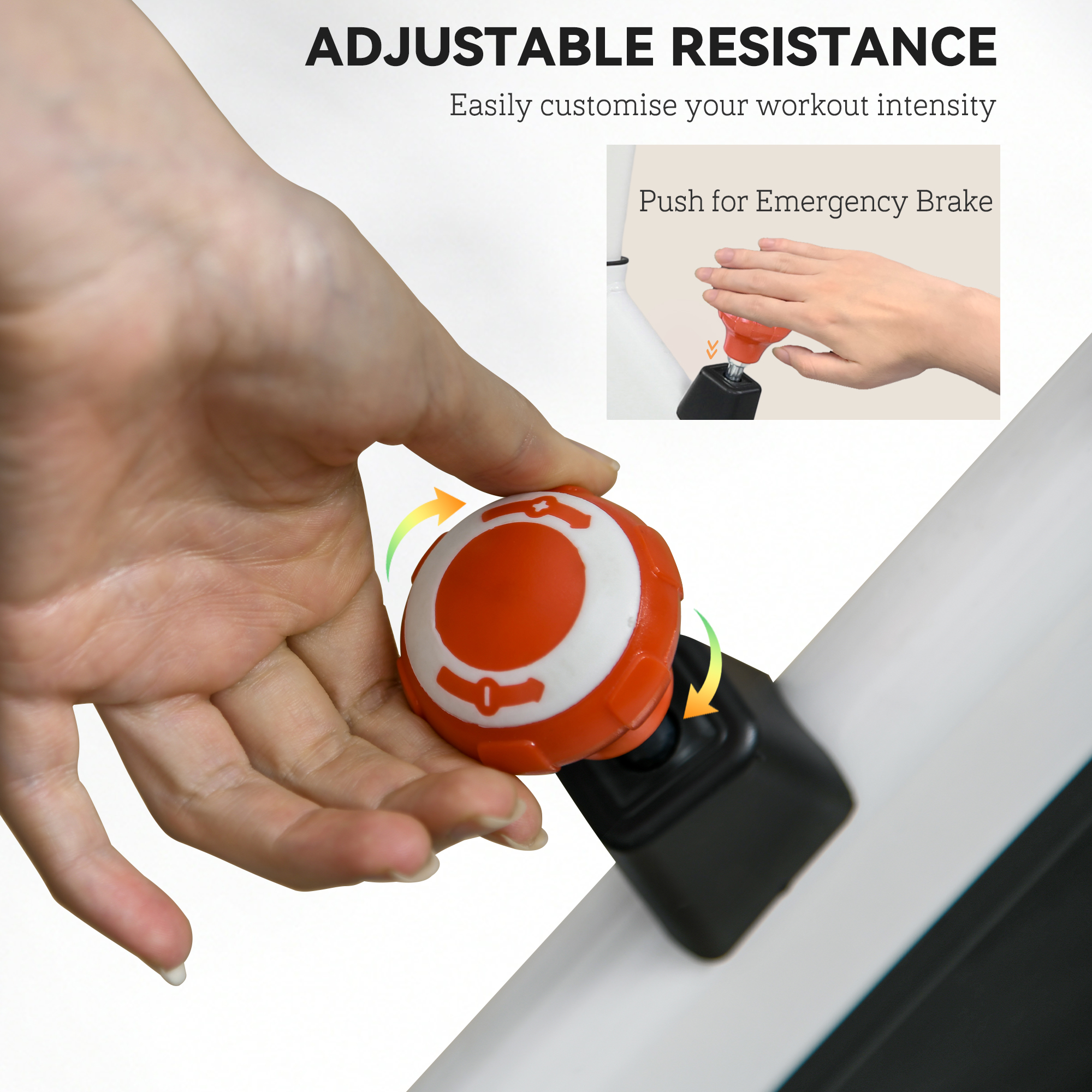 - Driving Method: The cardio machine is built with adjustable resistance with knob system which is convenient for you to customize your workout. Pressing the resistance knob down is an emergency stop
