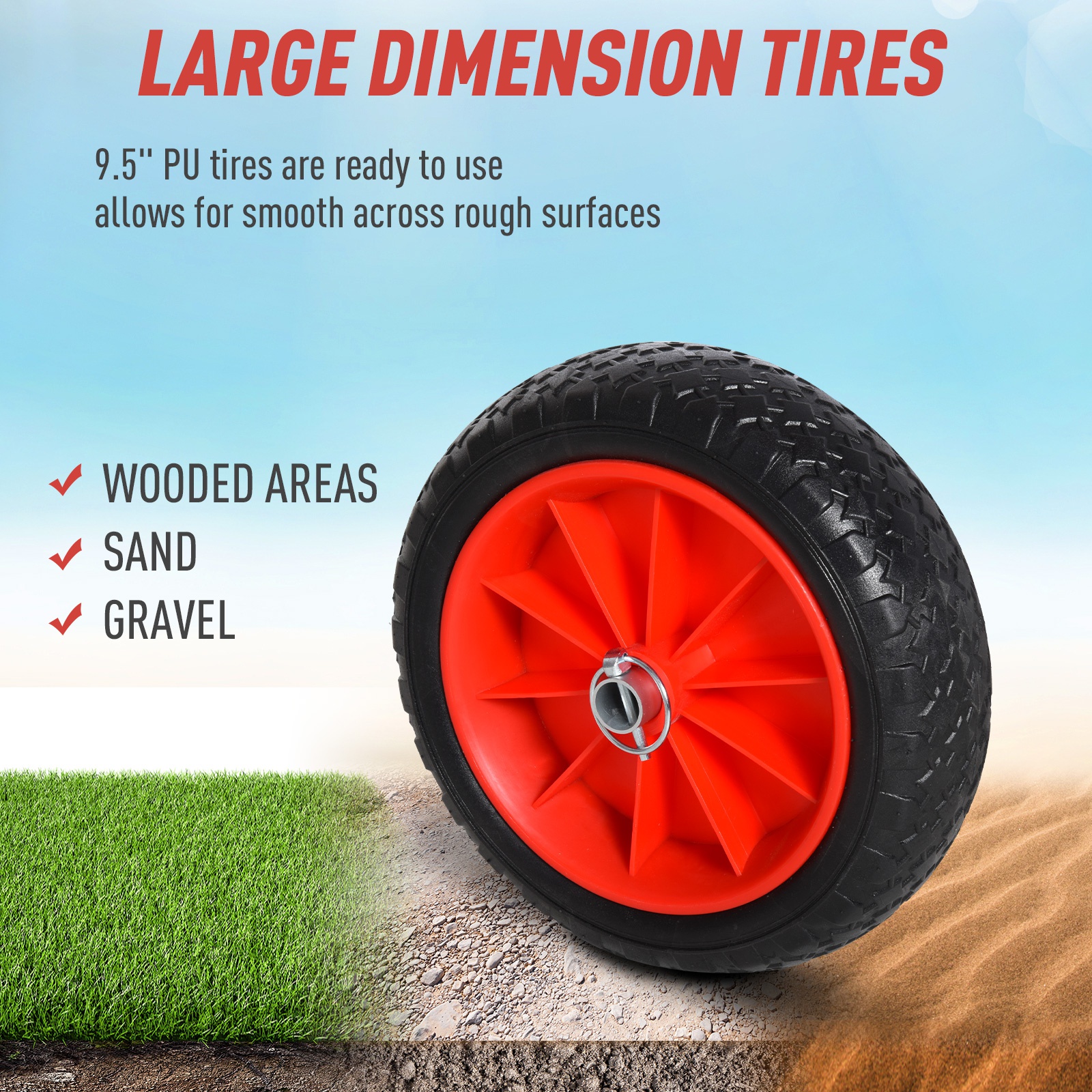 - Large Dimension Tires: 9.5″ PU tires that are ready to use, large size tires allows for smooth movement across rough surfaces such as sand, gravel, and through wooded areas