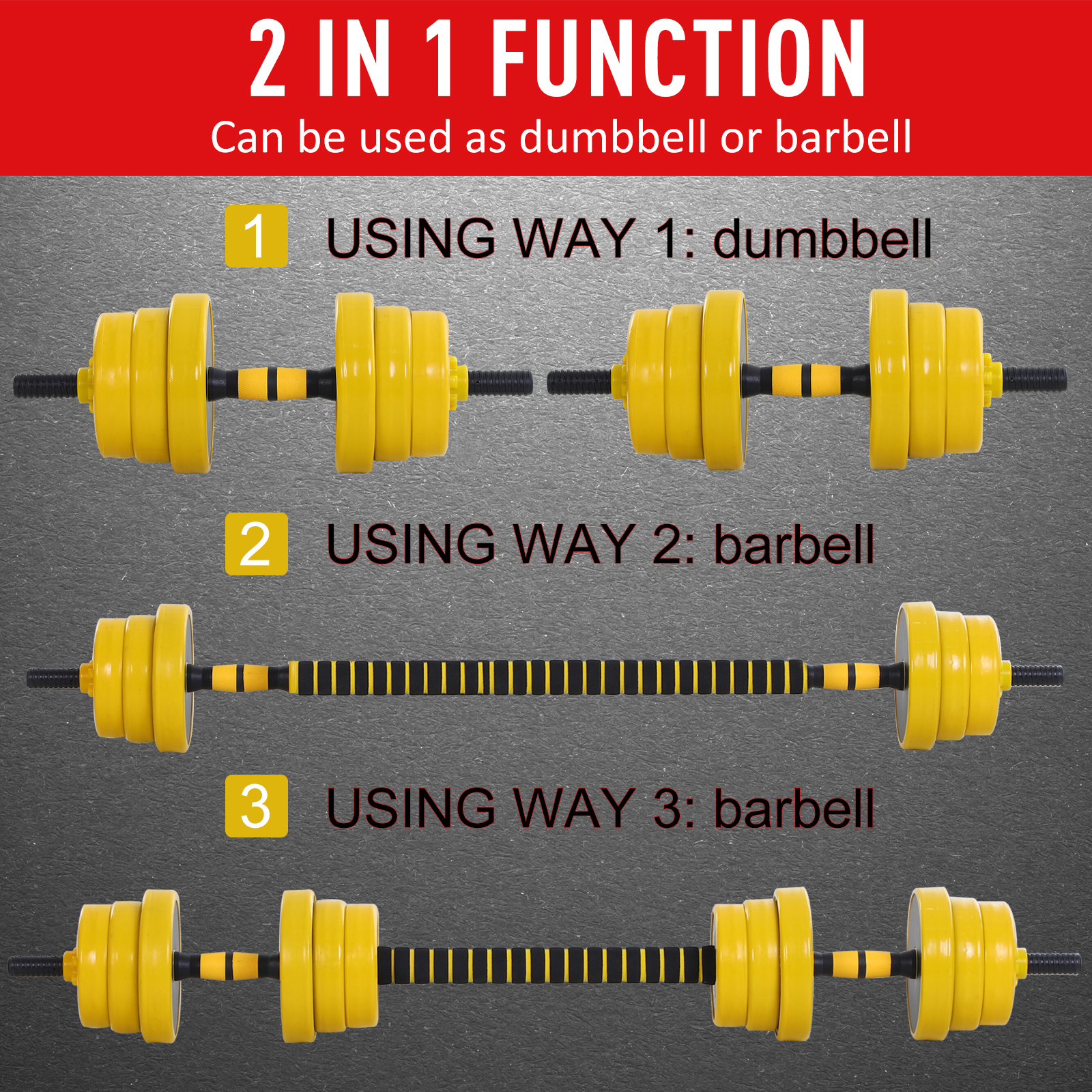 - Adjustable Dumbbell Set with Barbell:3 way of use,can be used as dumbbell or barbell. Four 6.05lbs Plates, Four 5.5lbs plate, Four 4.4lbs plate and two 0.88lbs short poles (dumbbell bars) and a 1.1lbs long pole (barbell bar).